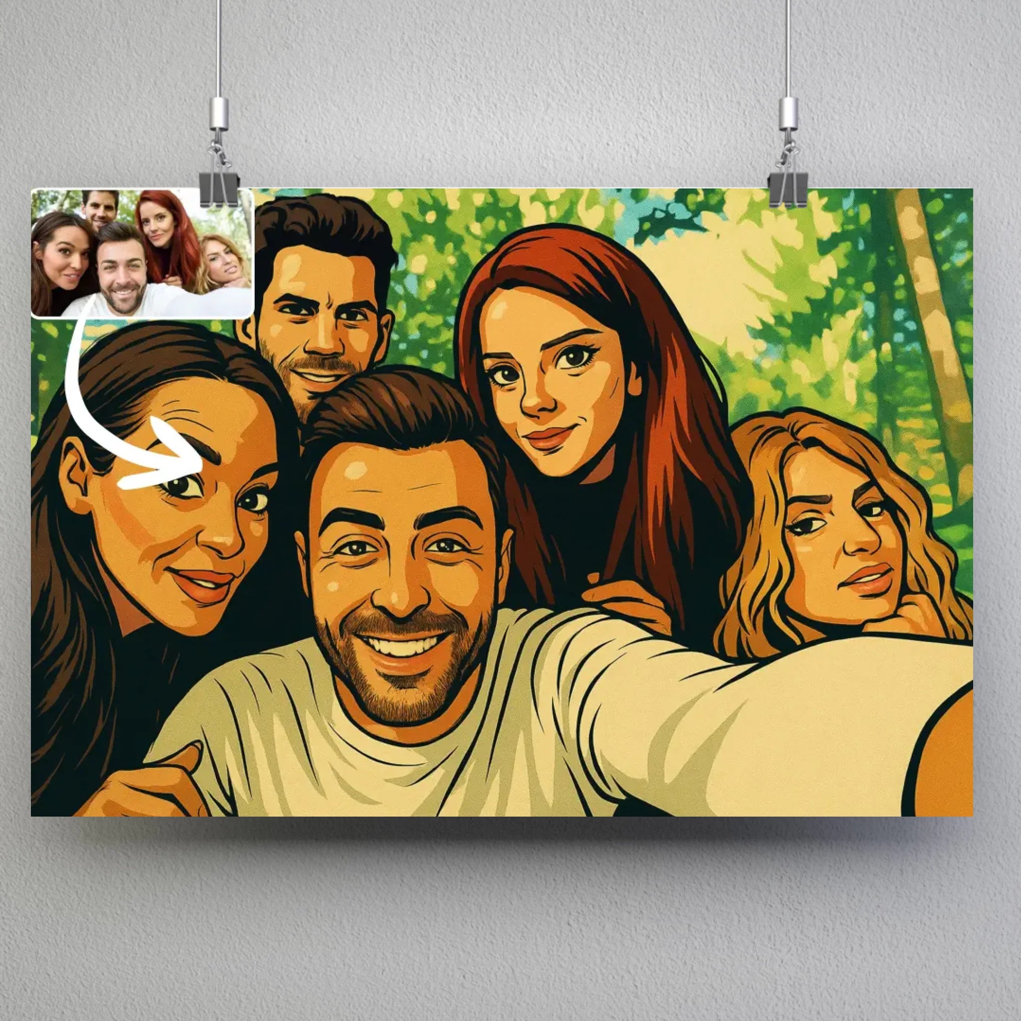 Affirmez votre style avec notre portrait horizontal personnalisé effet cartoon type GTA. Transformez votre photo en une illustration personnalisée style GTA moderne, audacieuse et pleine de caractère. Grâce à notre logiciel de transformation, vos visages deviennent ceux de véritables protagonistes dignes d’une couverture de jeu vidéo culte, avec un rendu coloré, contrasté et résolument urbain.