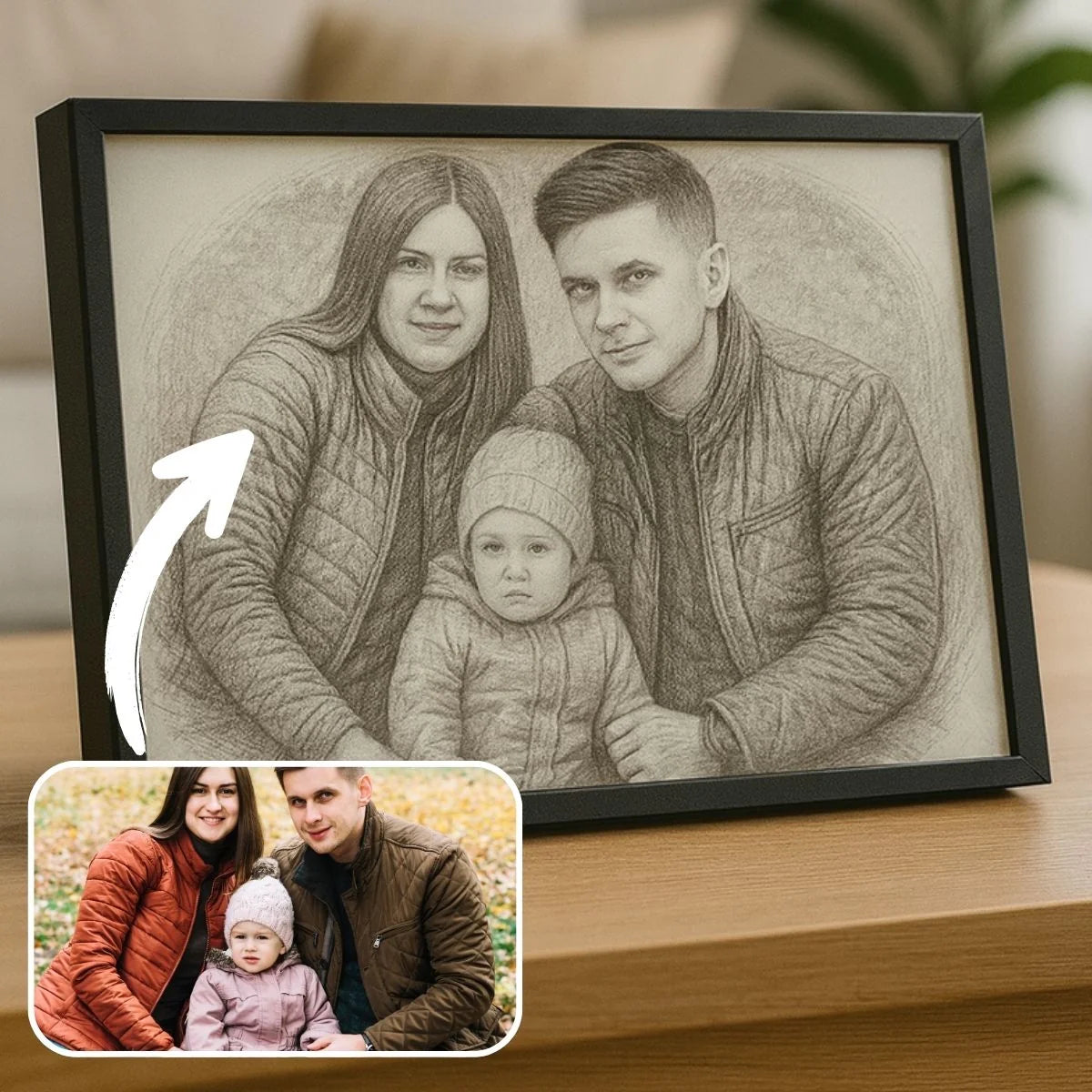 Offrir une illustration personnalisée style graphite, c’est offrir une œuvre sobre, élégante et profondément émotive. Chaque regard posé sur ce tableau évoque la tendresse et la beauté des souvenirs partagés.
