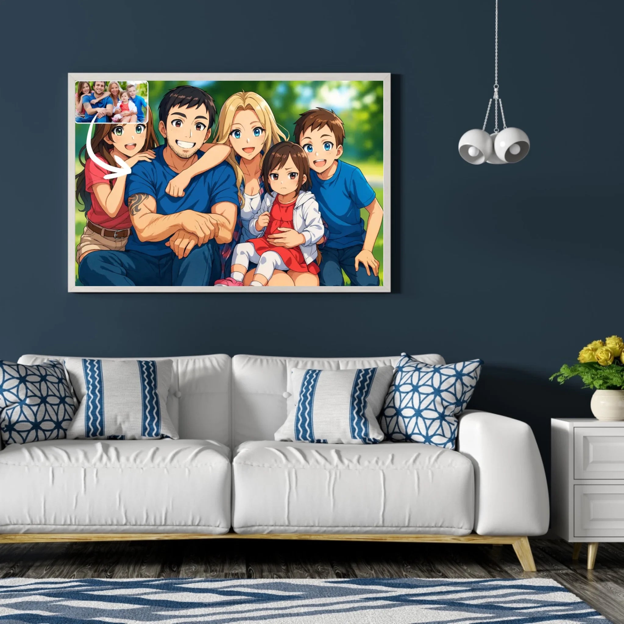 Chez Toile Unique, nous croyons que vos souvenirs méritent d’être sublimés à travers des univers qui vous ressemblent. Ce portrait horizontal personnalisé style anime japonais manga est bien plus qu’un tableau : c’est une création vibrante, artistique et émotive, qui transforme vos photos en véritables scènes d’animation japonaise.