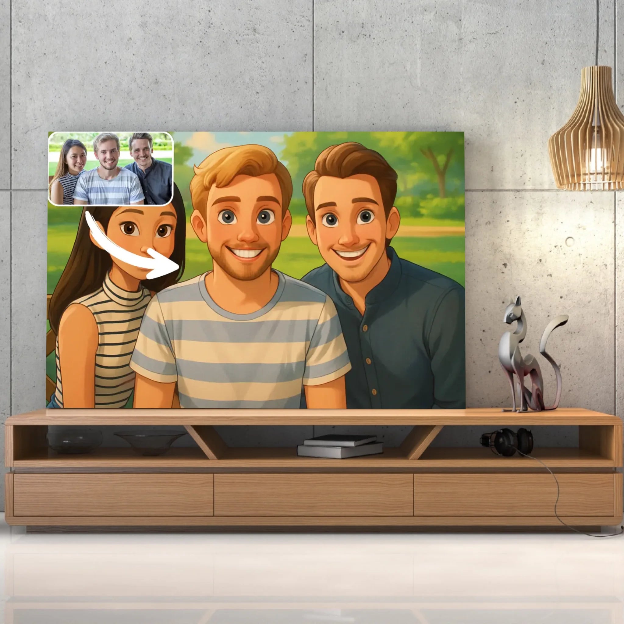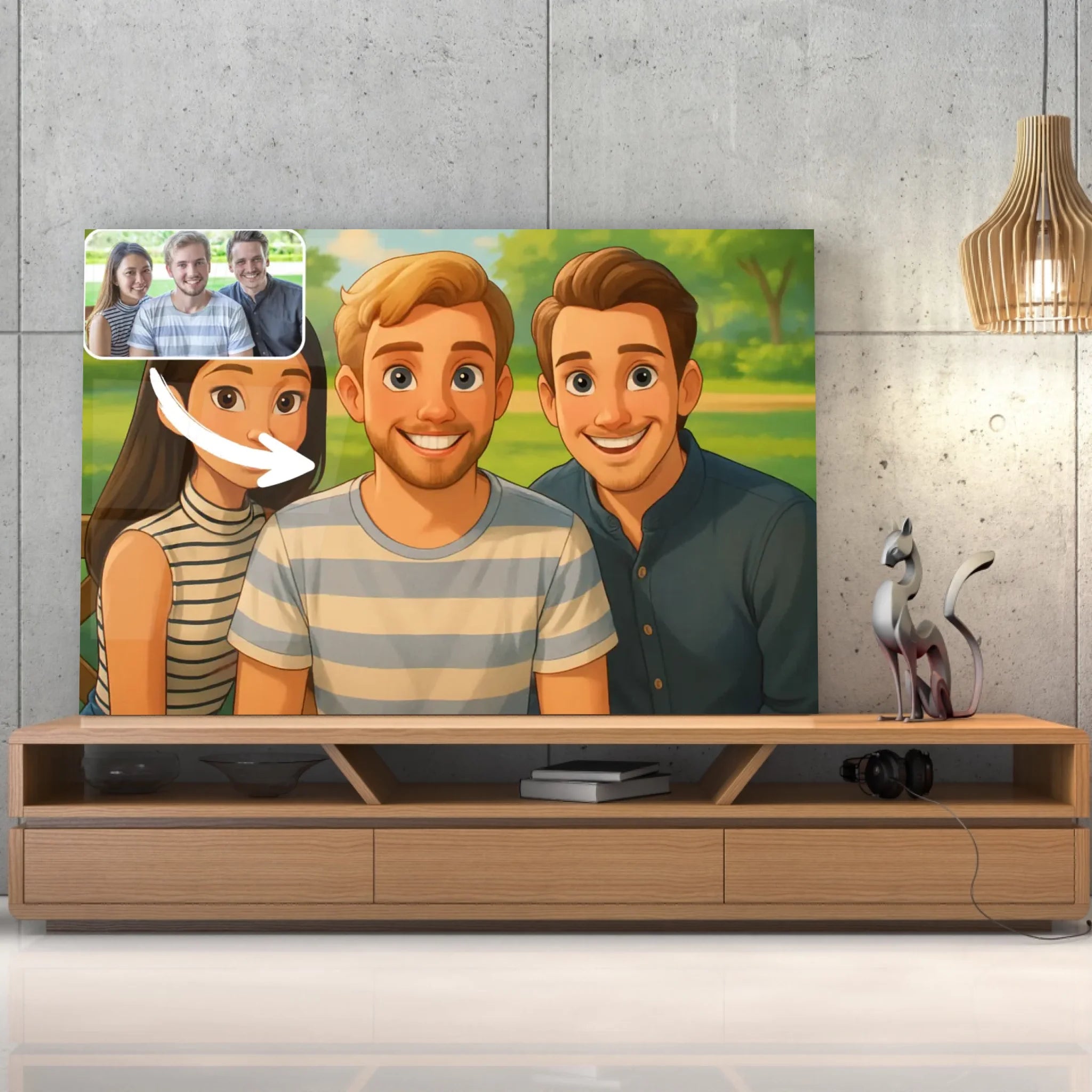 Le format horizontal permet d’intégrer plusieurs personnages avec équilibre et de créer une scène fluide et naturelle. Vous pouvez ensuite choisir le support qui correspond à votre intérieur, que ce soit une toile, une affiche ou un tableau en verre acrylique. Grâce à l’aperçu en temps réel, vous visualisez votre création avant sa fabrication.