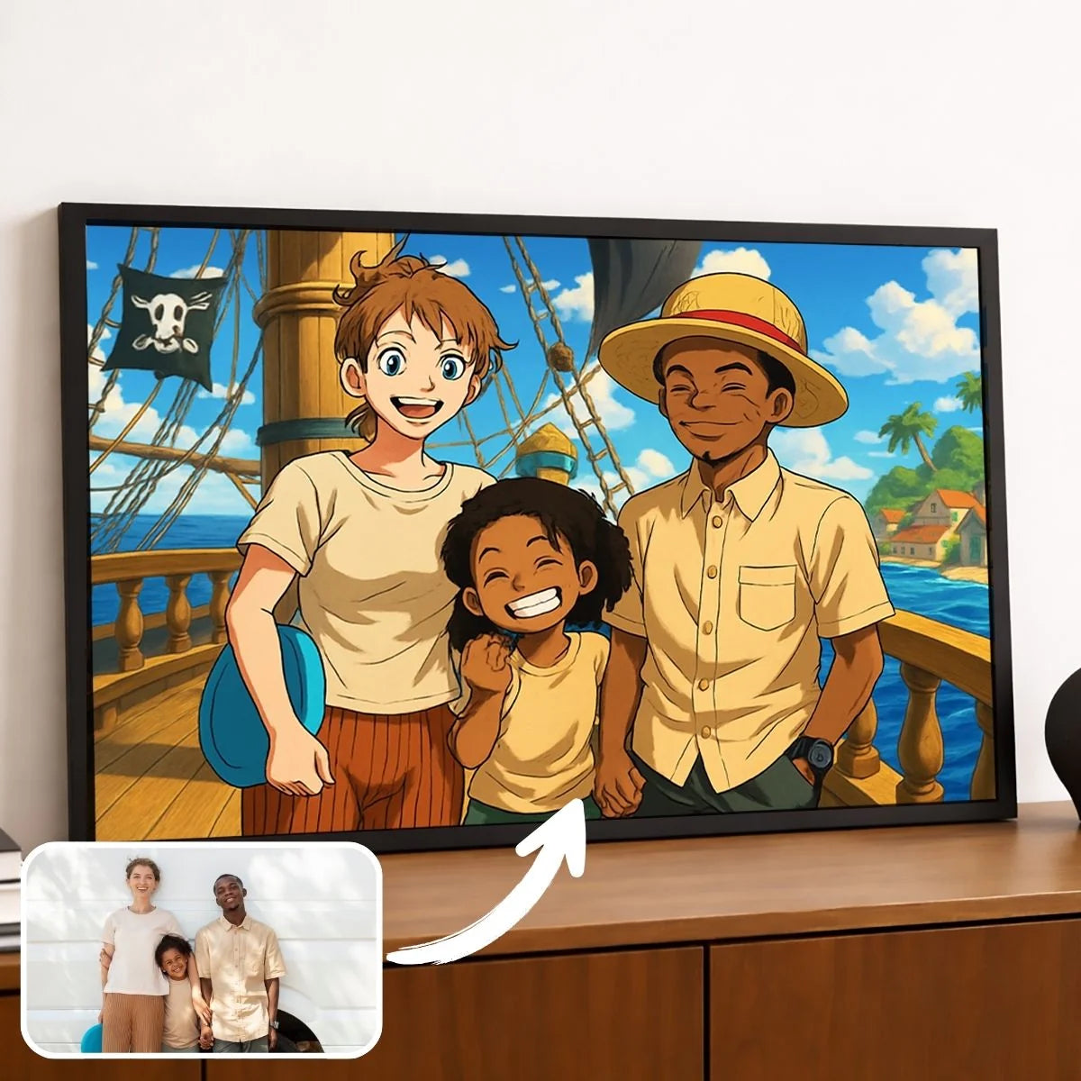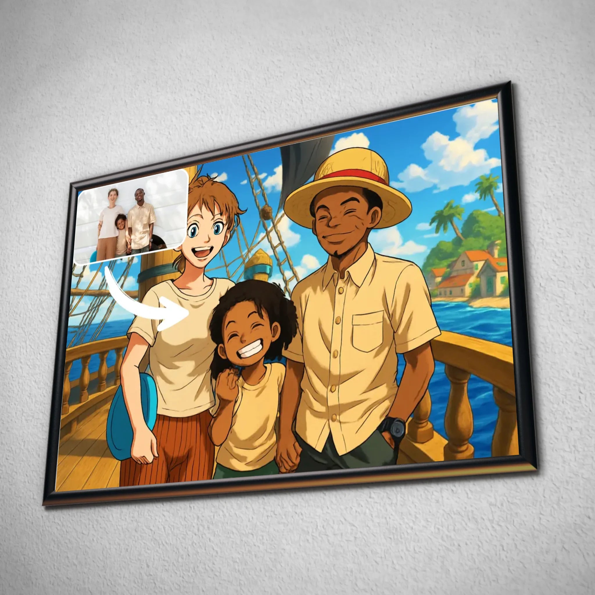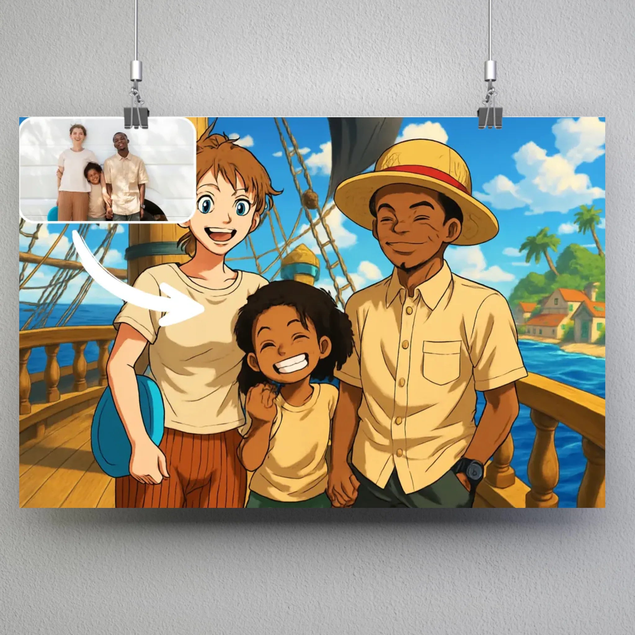 Prenez le large et donnez une dimension épique à vos souvenirs avec notre portrait horizontal personnalisé style One Piece. Transformez votre photo en une illustration personnalisée inspirée de l’univers des pirates, où chaque détail évoque l’aventure, la liberté et l’esprit d’équipage. Grâce au format horizontal, vous pouvez réunir plusieurs personnages dans une même scène et créer une véritable composition digne d’un équipage prêt à conquérir les mers.