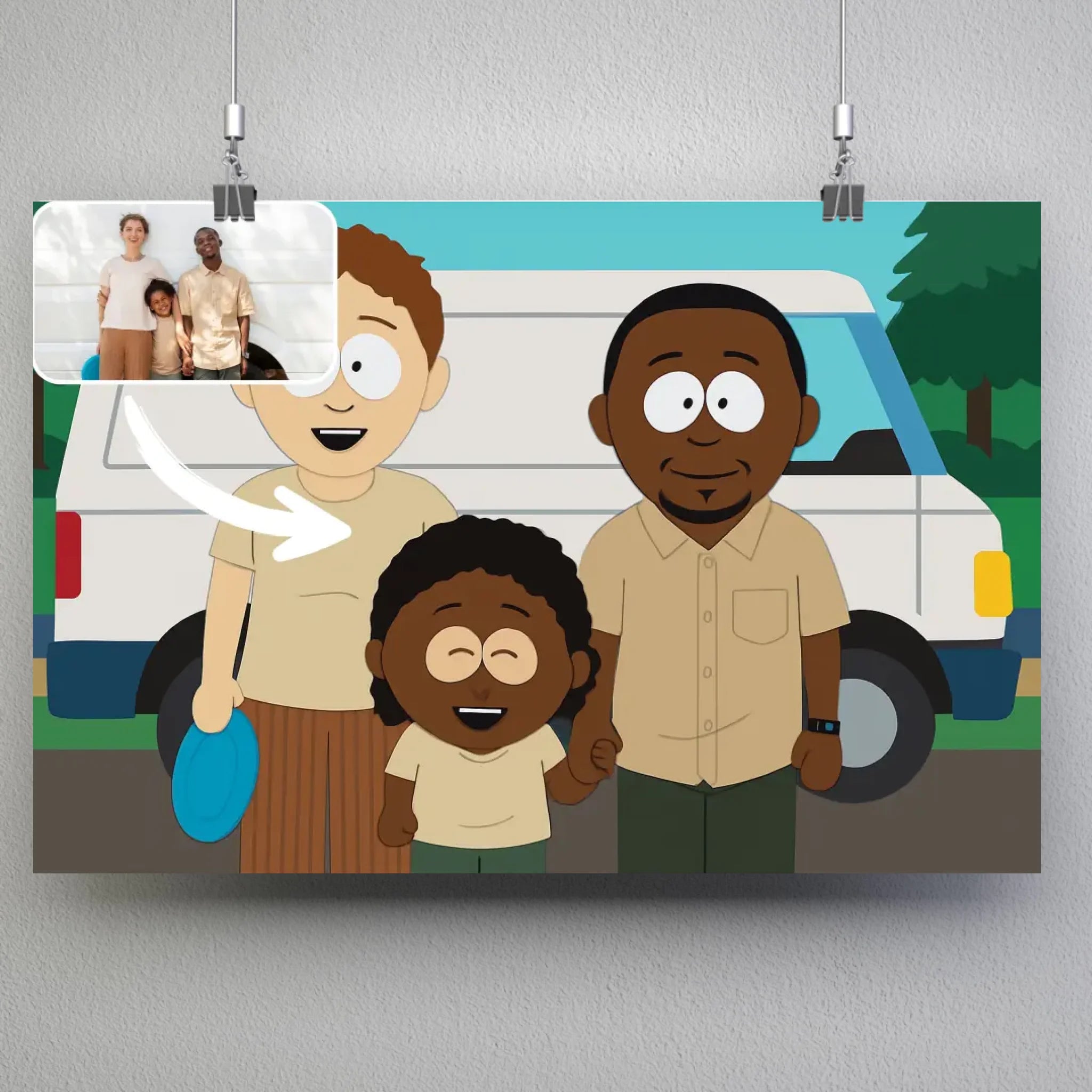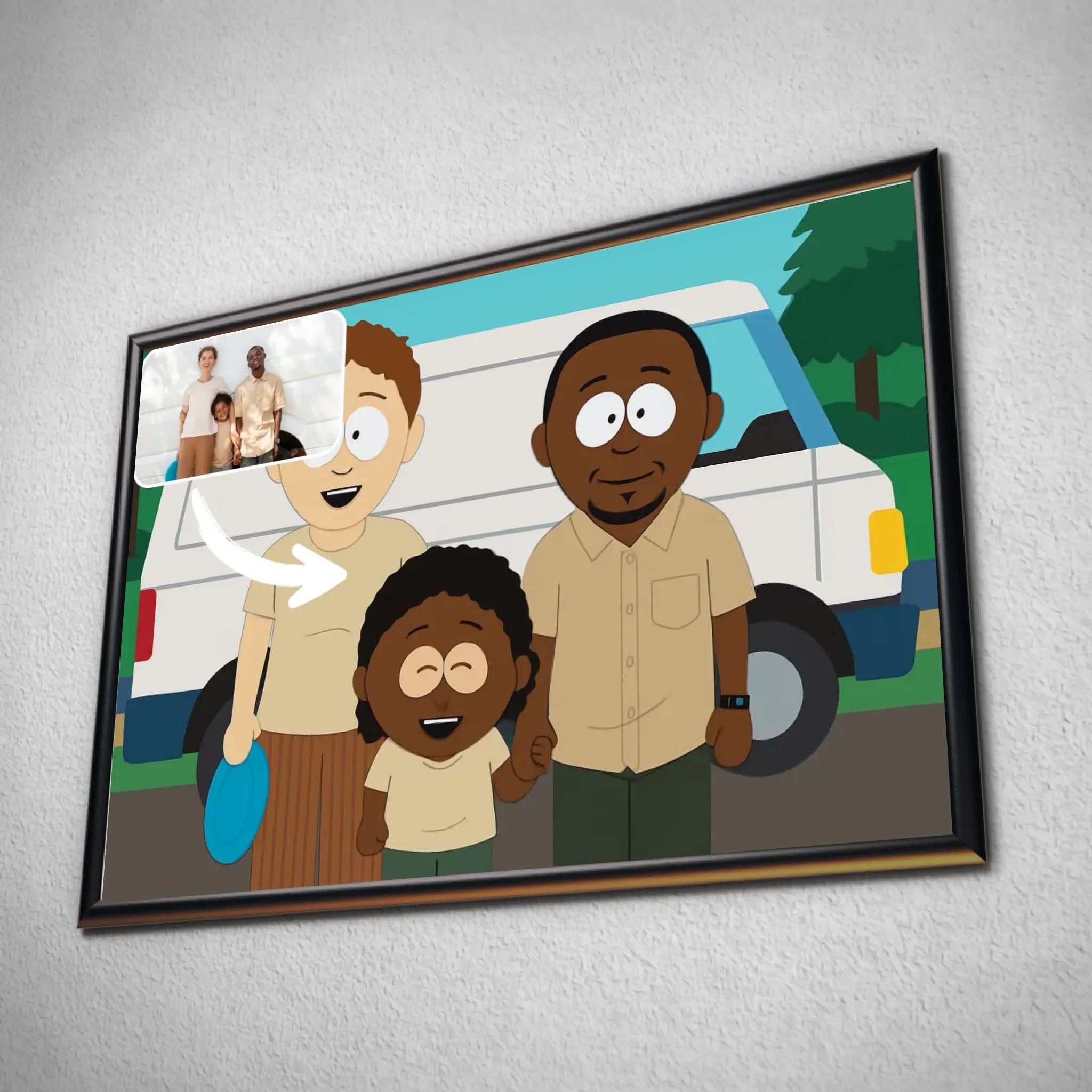 Donnez une touche décalée et originale à vos souvenirs avec notre portrait horizontal personnalisé style South Park. Transformez votre photo en une illustration personnalisée inspirée de cet univers culte, avec ses personnages reconnaissables et son style unique. Grâce au format horizontal, vous pouvez mettre en scène plusieurs personnes dans une composition amusante, comme si vous étiez les héros de votre propre épisode.