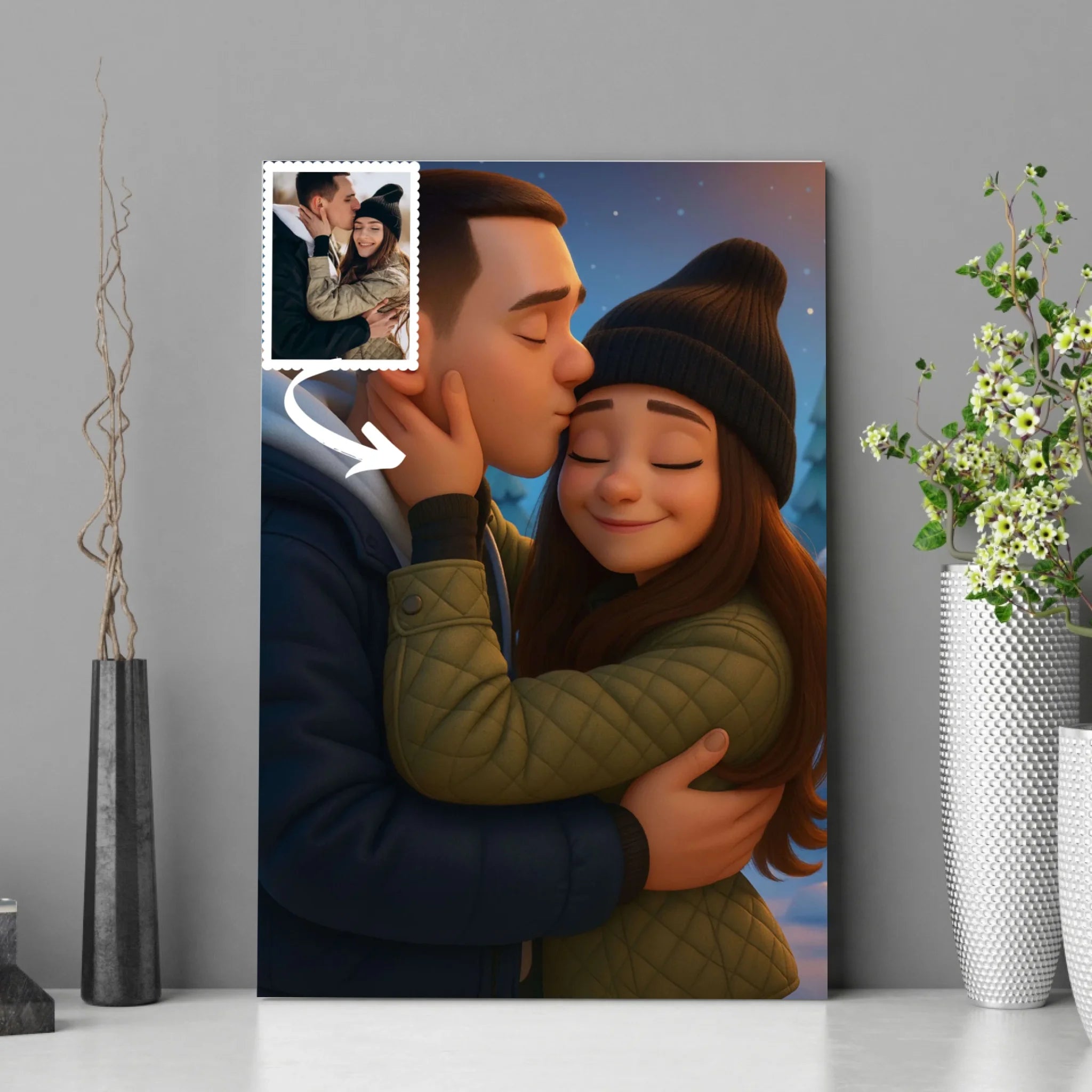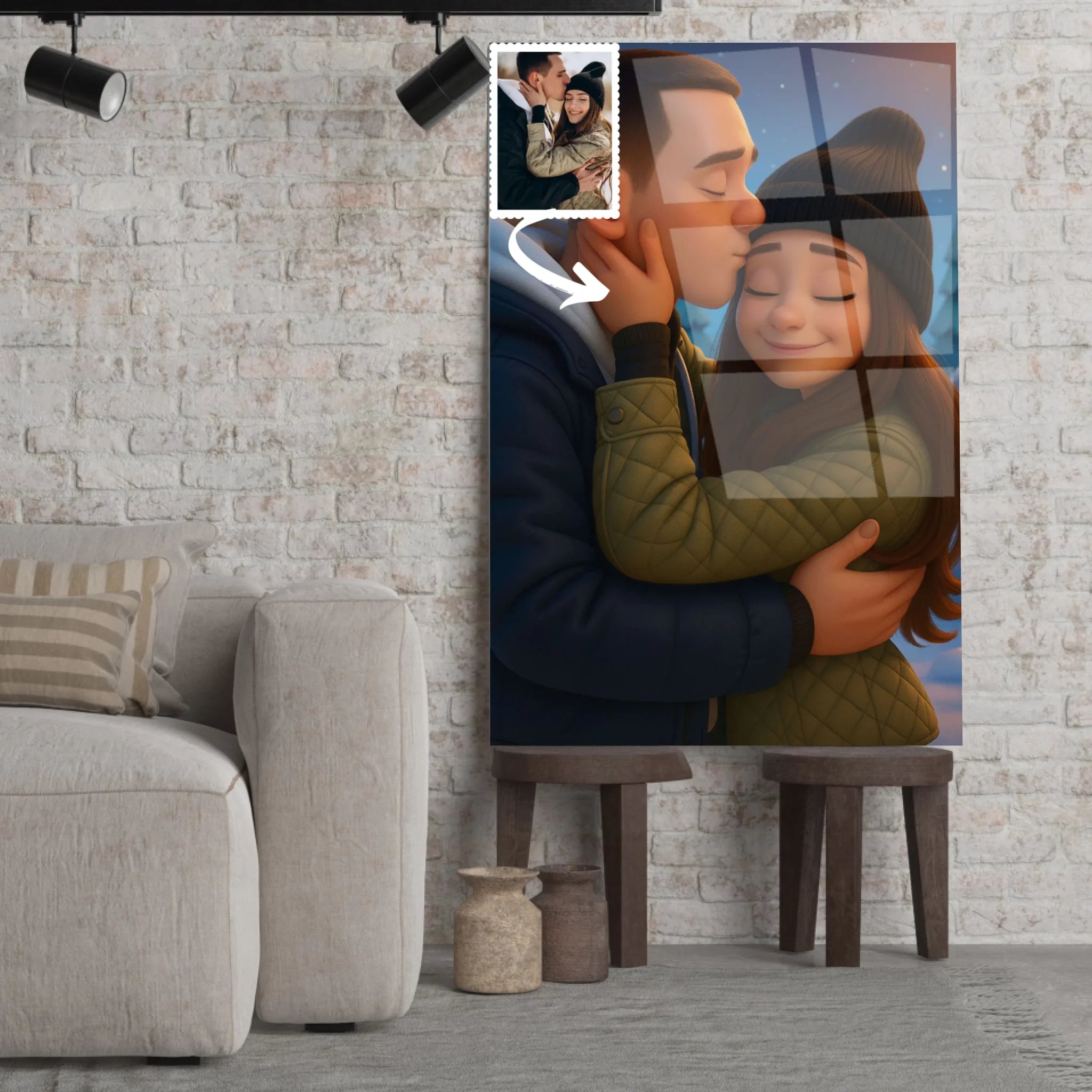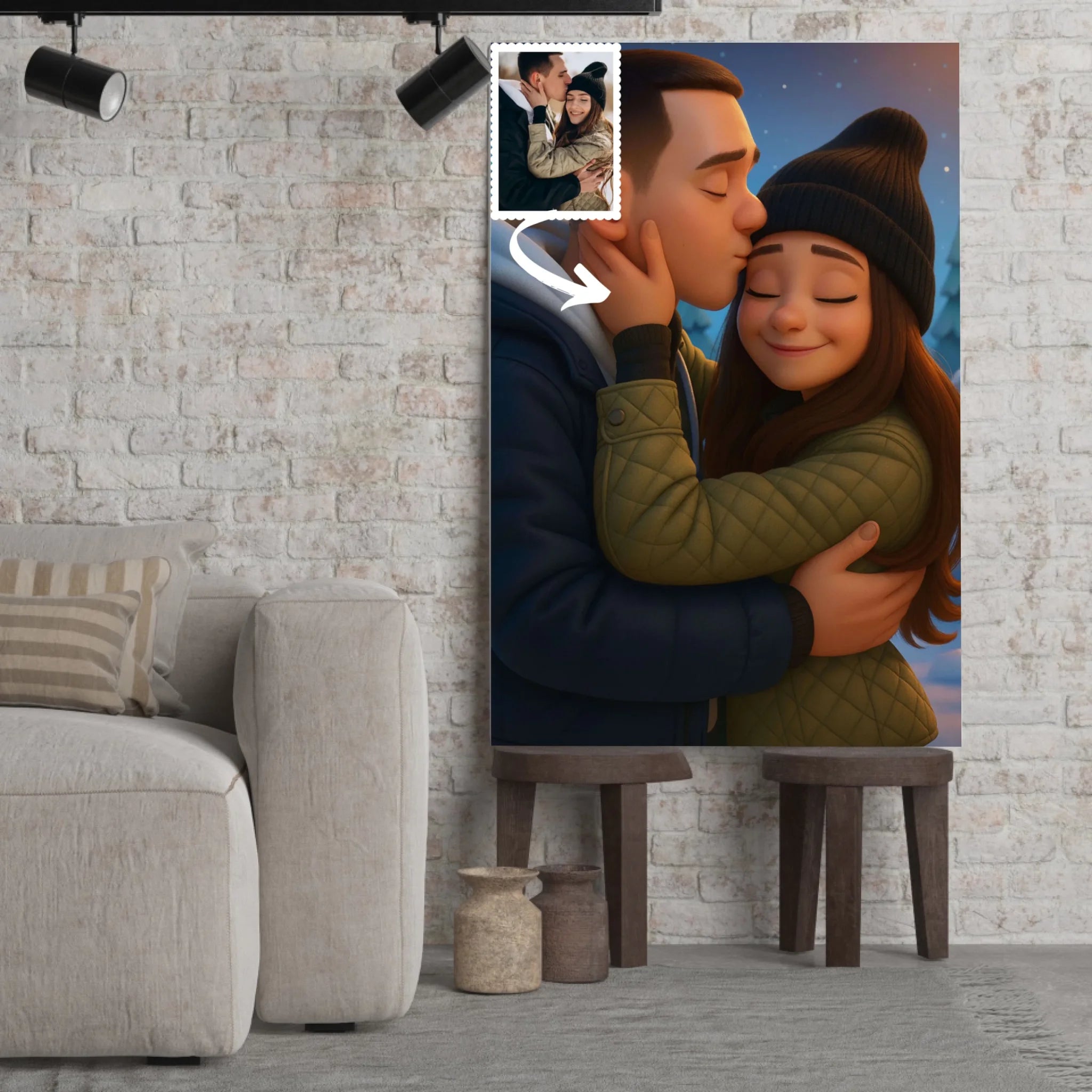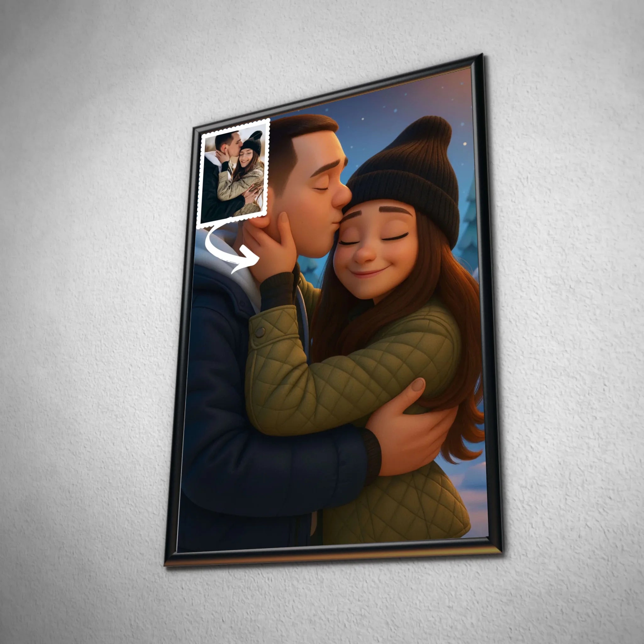Chez Toile Unique, nous donnons une nouvelle dimension à vos souvenirs. Votre toile personnalisée style Pixar 3D capture vos expressions, vos émotions et votre personnalité dans un rendu coloré et réaliste, digne des plus beaux films d’animation. Que ce soit pour un couple, une famille ou un groupe d’amis, ce portrait apportera une dose de bonne humeur et de féérie à votre intérieur.