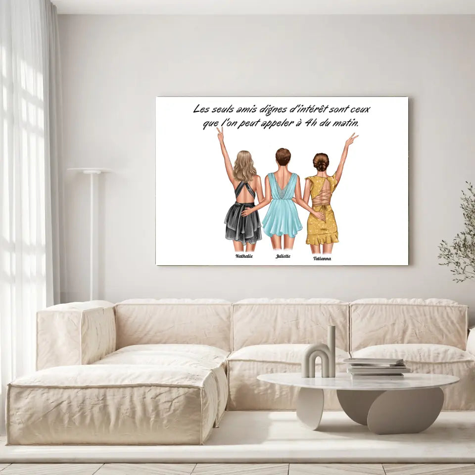 Cette œuvre personnalisable est parfaitement adapté pour retranscrire la complicité que vous avez avec votre groupe de copines. Que ce soit pour Noël, Pâques ou un anniversaire, ce tableau modélise à la perfection l’affection que vous portez à votre bande de potes. Beaucoup d’éléments sont modifiables vous permettant de modéliser sur toile ou poster l’image de vos meilleures amies.