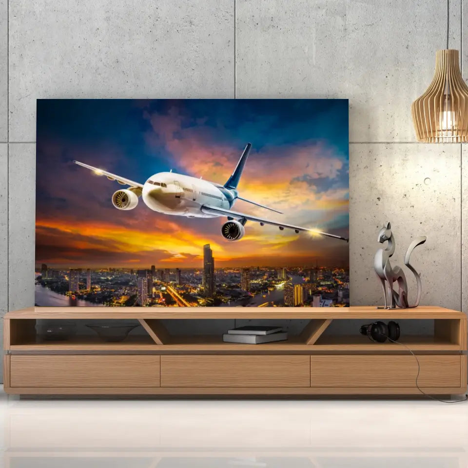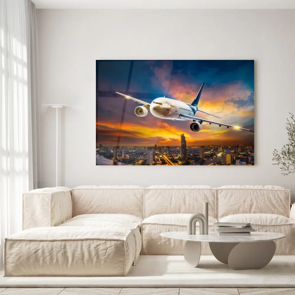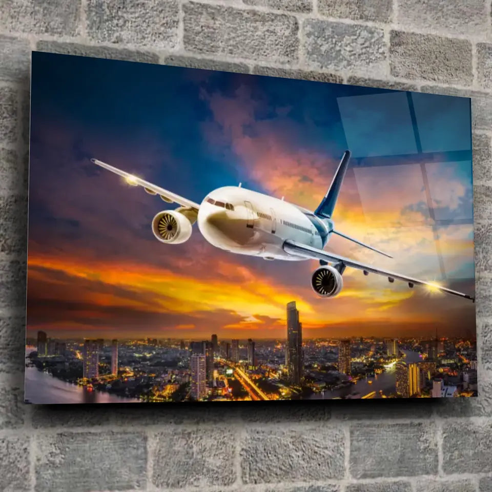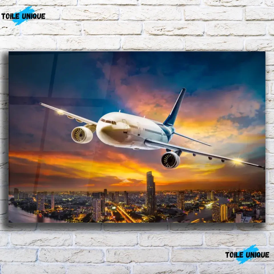 Notre tableau d'un avion en vol nocturne offre une perspective saisissante sur l'agitation urbaine depuis les cieux. L'image capture la beauté d'un coucher de soleil illuminant le ciel et la ville en dessous, soulignant la grandeur du voyage aérien. C'est une œuvre qui inspire l'évasion et réveille l'âme des voyageurs et des rêveurs.