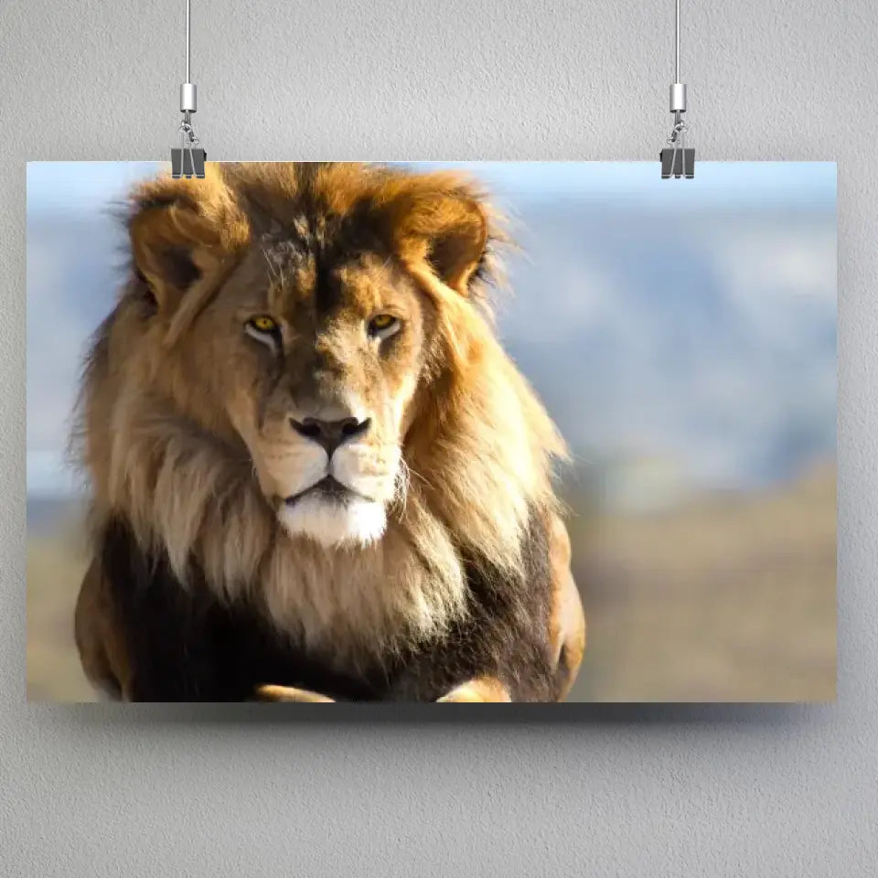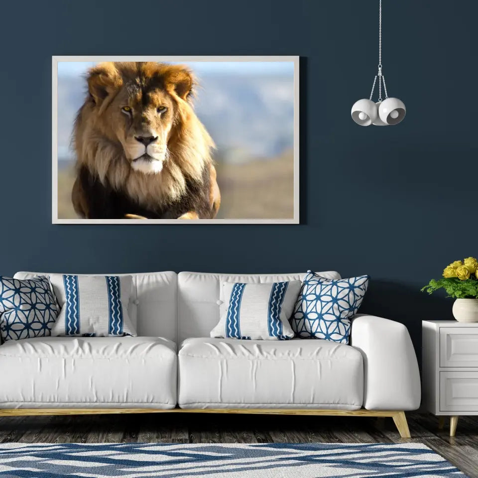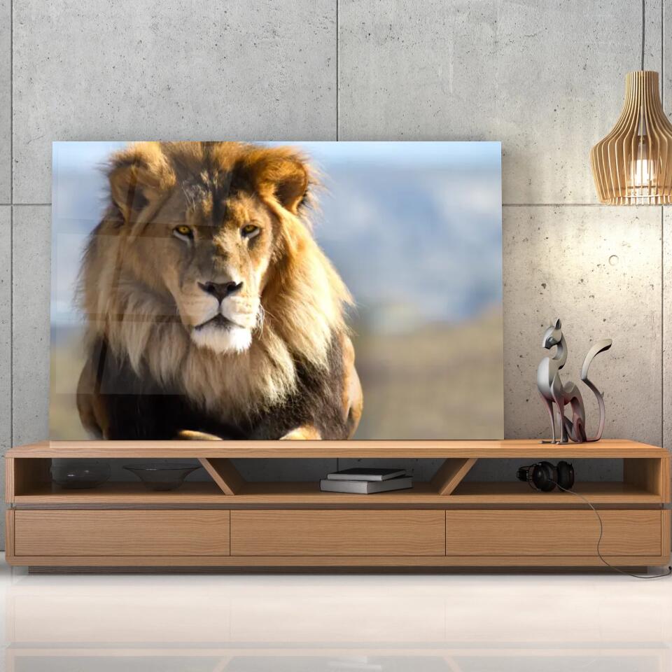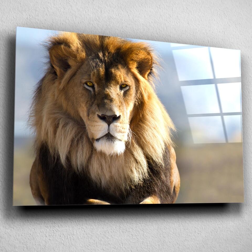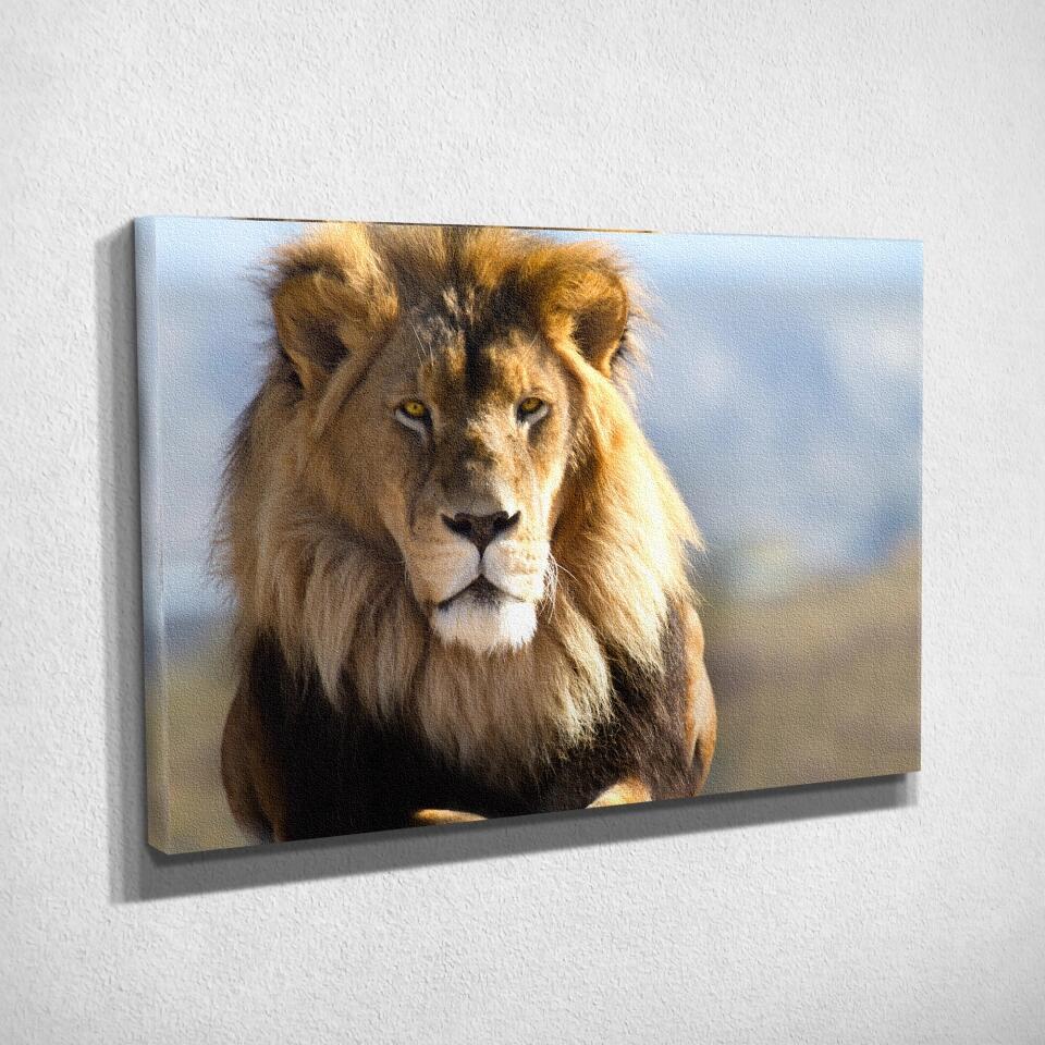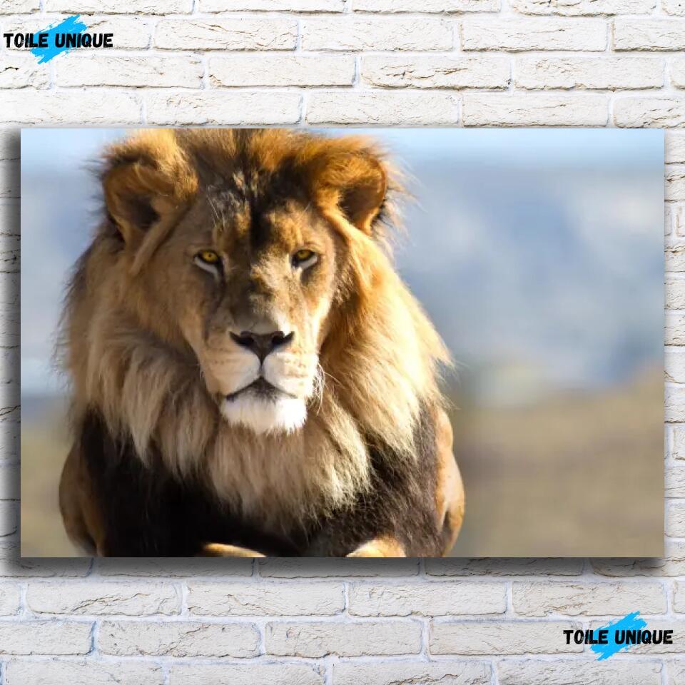 Ce tableau décoratif présente un portrait saisissant d'un lion d'Afrique, peint avec des couleurs vives et des détails impressionnants.