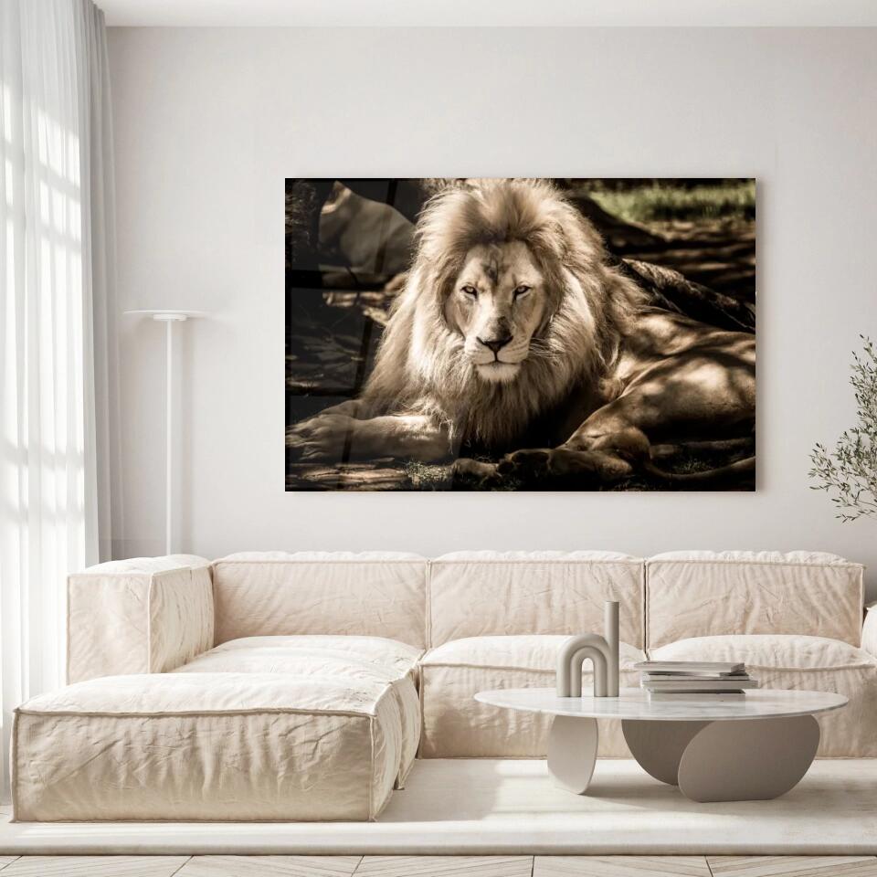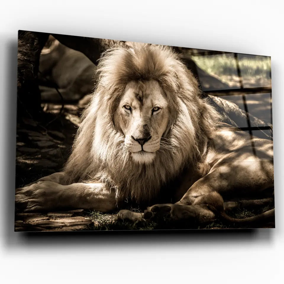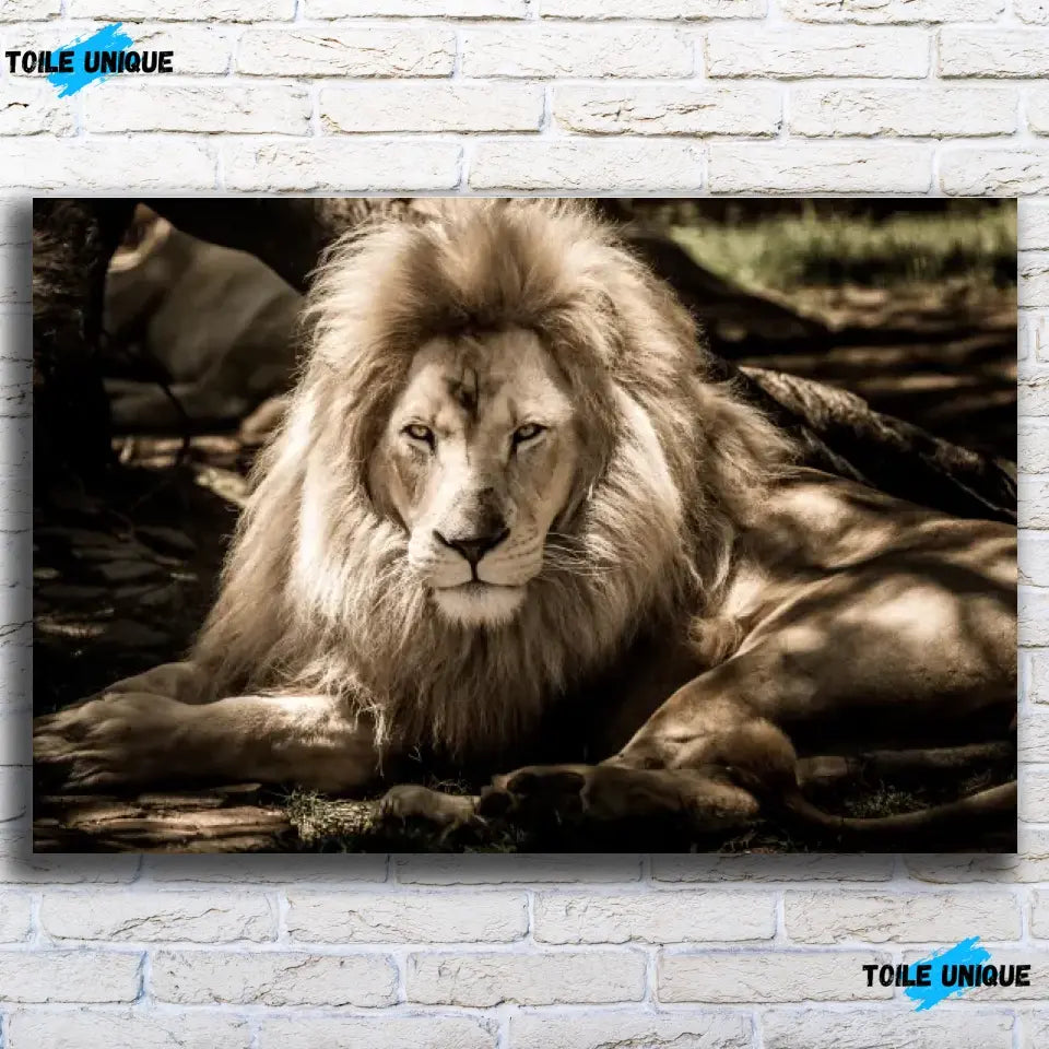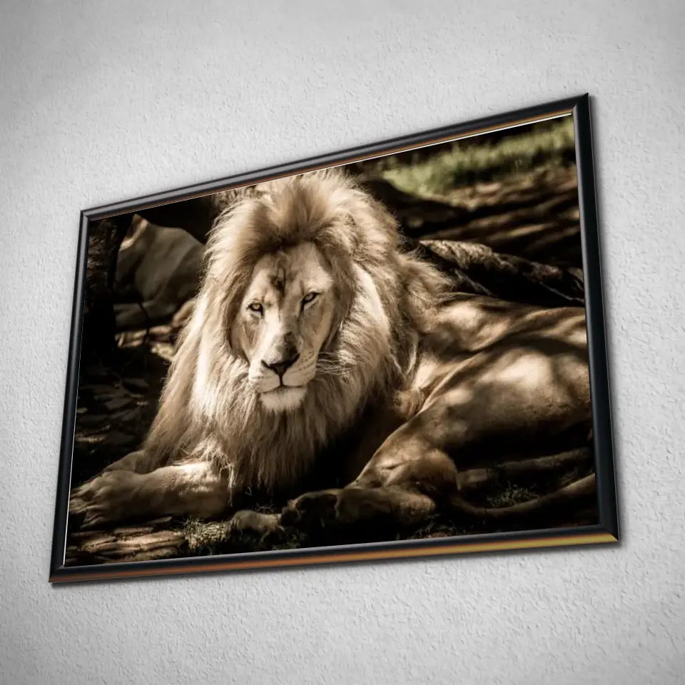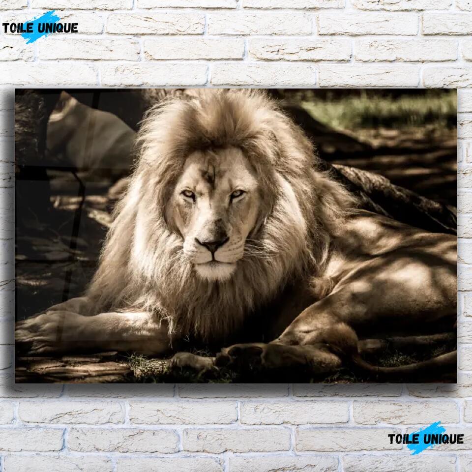 Ce tableau décoratif présente un lion de l'Atlas paisiblement couché à l'ombre d'un arbre, son regard perçant captivant le spectateur.
