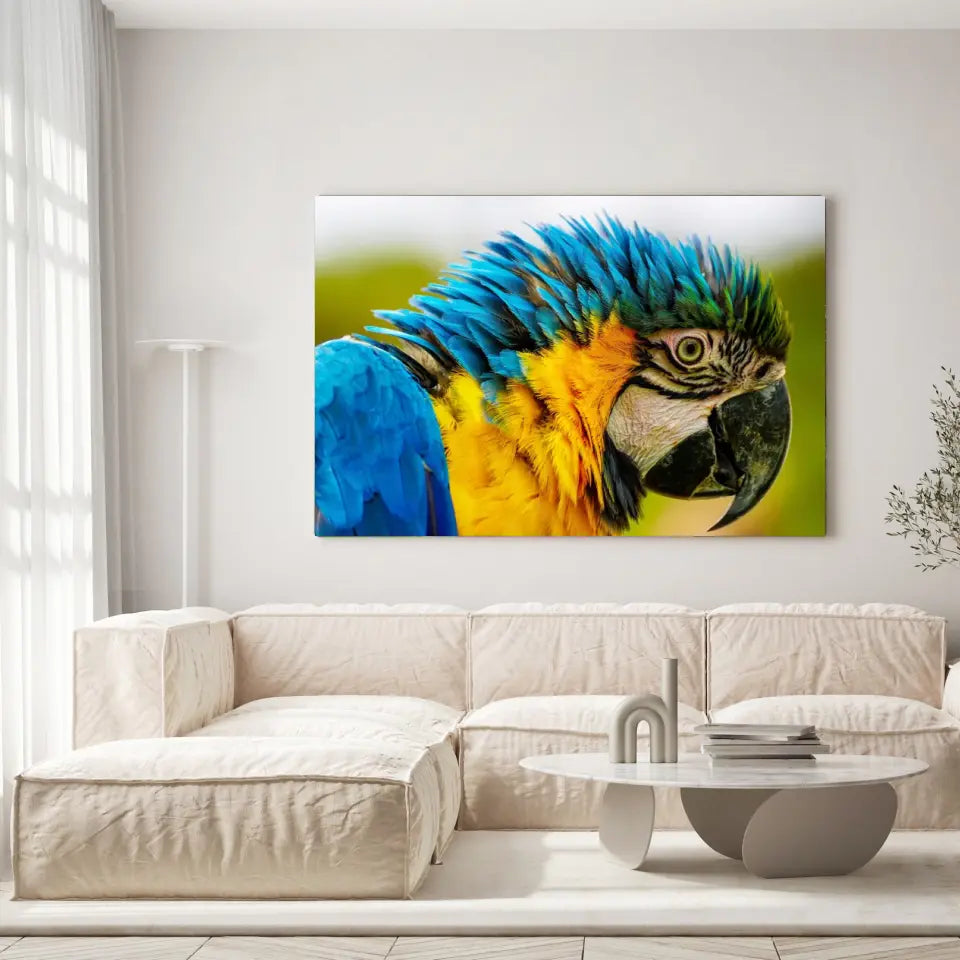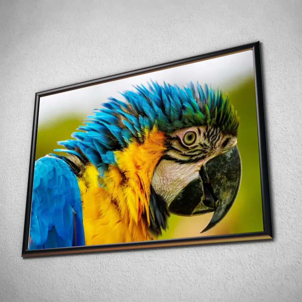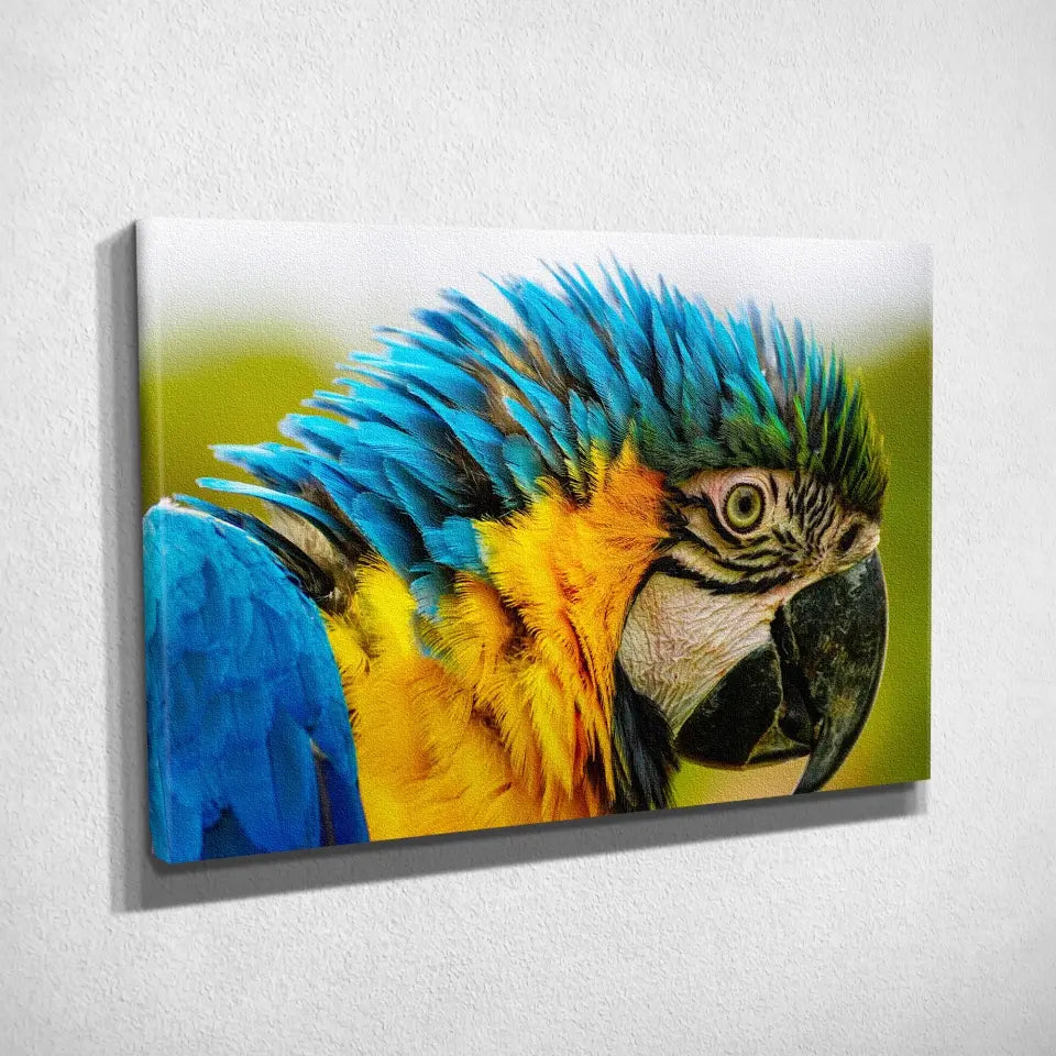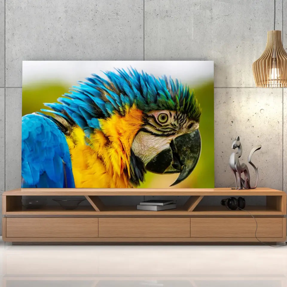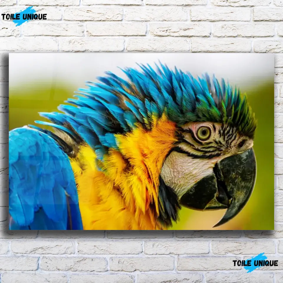 Ce tableau décoratif est une représentation éblouissante d'un perroquet coloré, vu de côté en gros plan.
