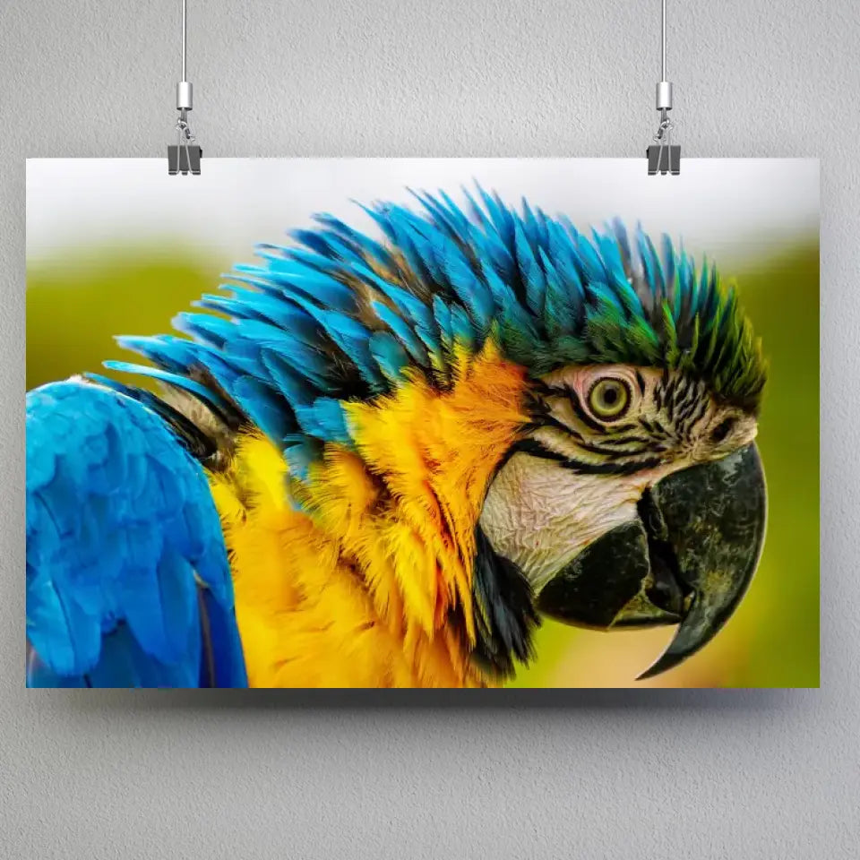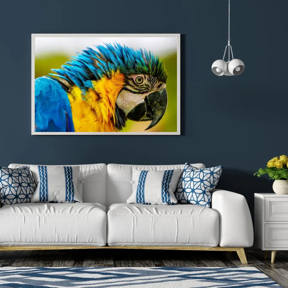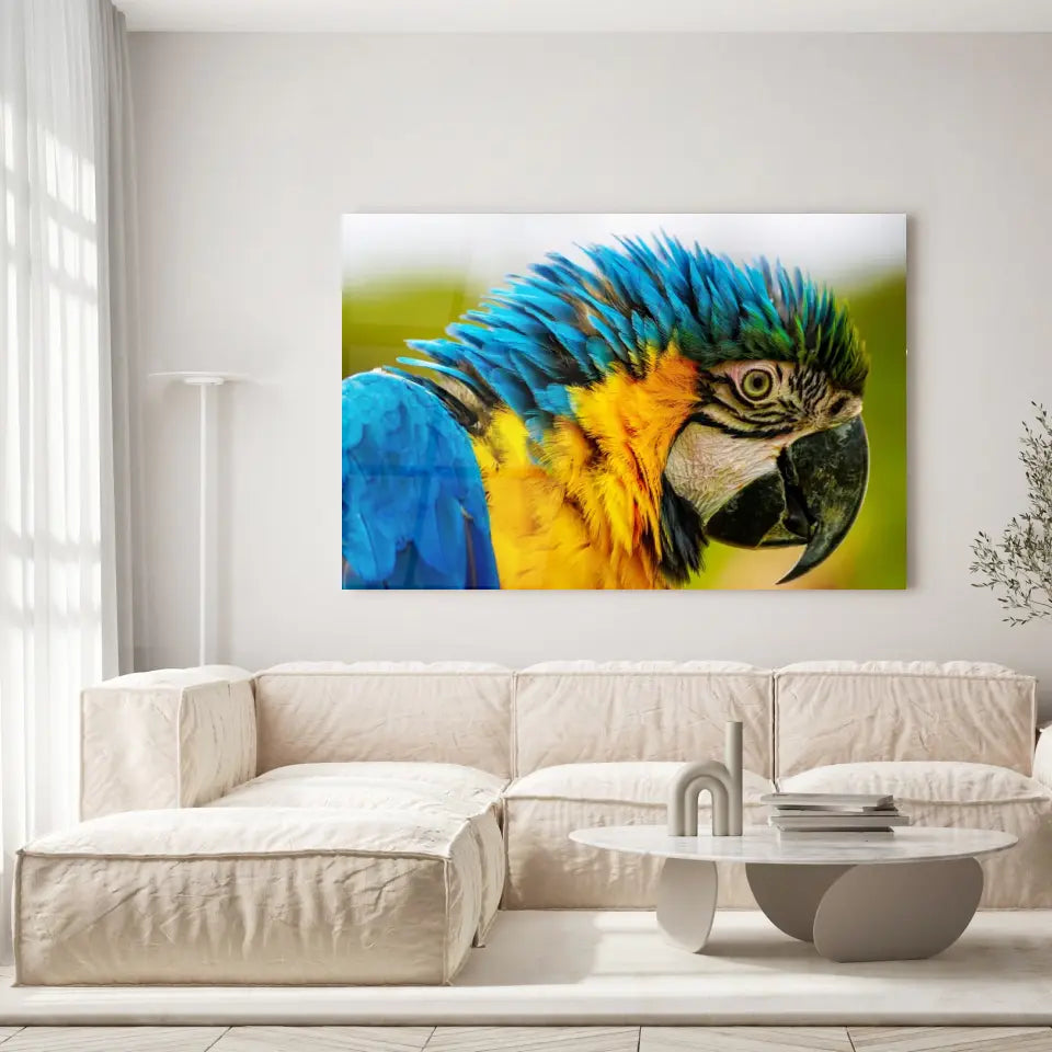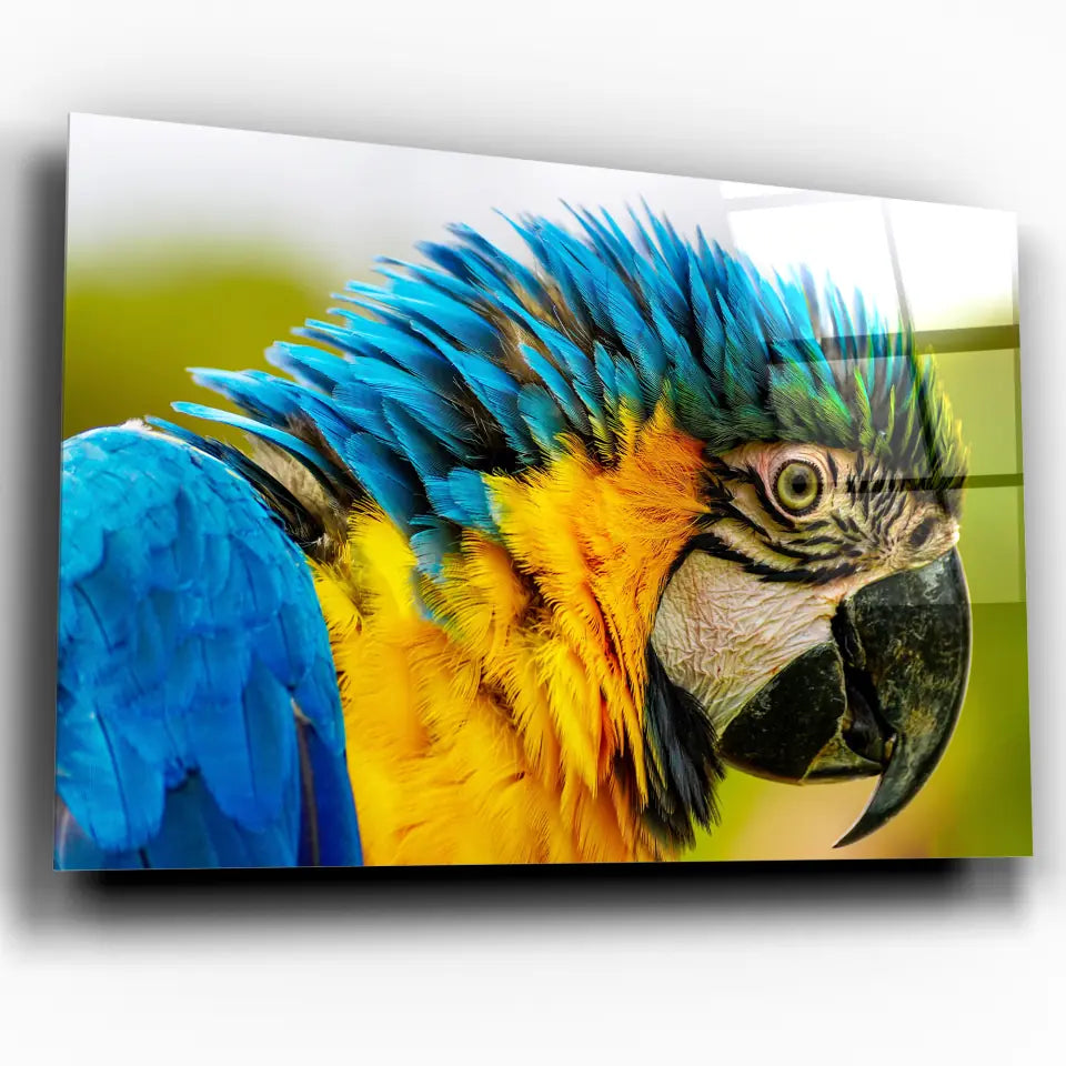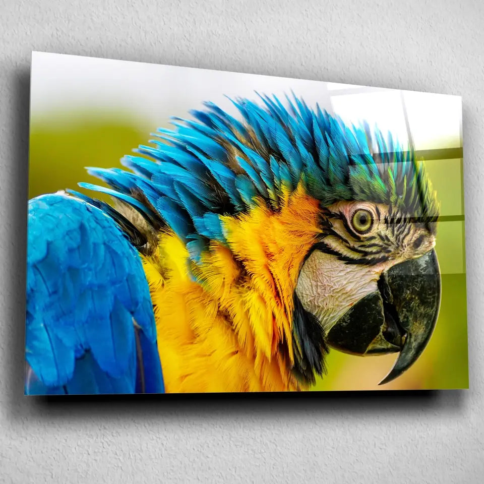 Ce tableau décoratif est une représentation éblouissante d'un perroquet coloré, vu de côté en gros plan.