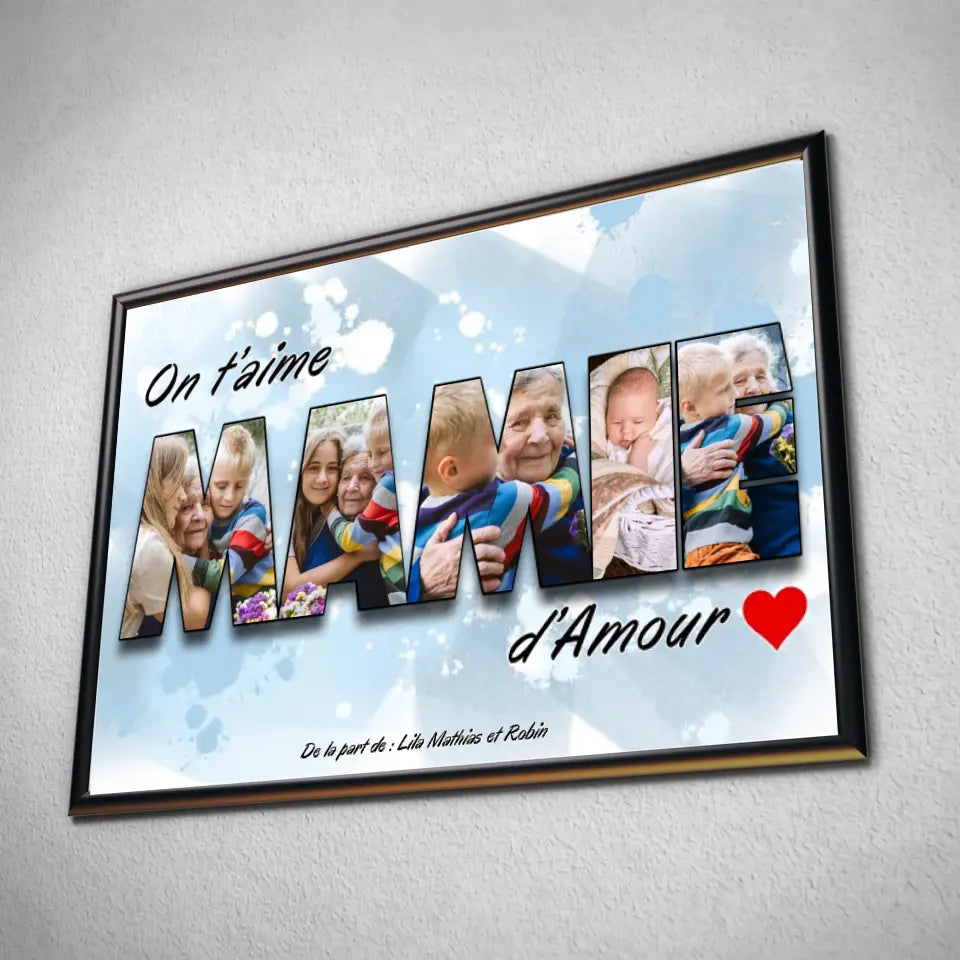 Vous cherchez LE cadeau parfait pour la Fête des Grands-Mères ? Celui qui fera briller les yeux de votre mamie, qui lui rappellera chaque jour combien elle est précieuse et qui lui donnera envie de le montrer à toutes ses amies ? Ne cherchez plus ! Notre affiche personnalisée "MAMIE" est un cadeau rempli d’amour et de souvenirs inoubliables.