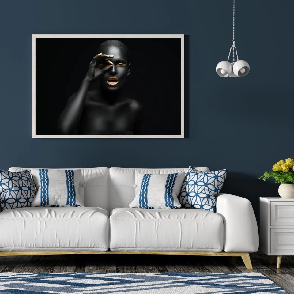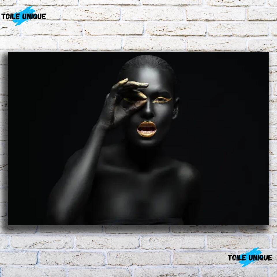 Ce tableau femme en noir et or représente une femme sur un fond sombre toute revêtue de noir et maquillé d’or autour des yeux, des lèvres et des doigts.