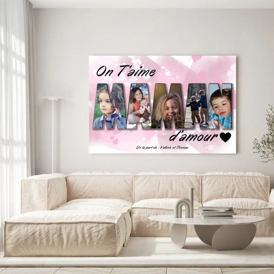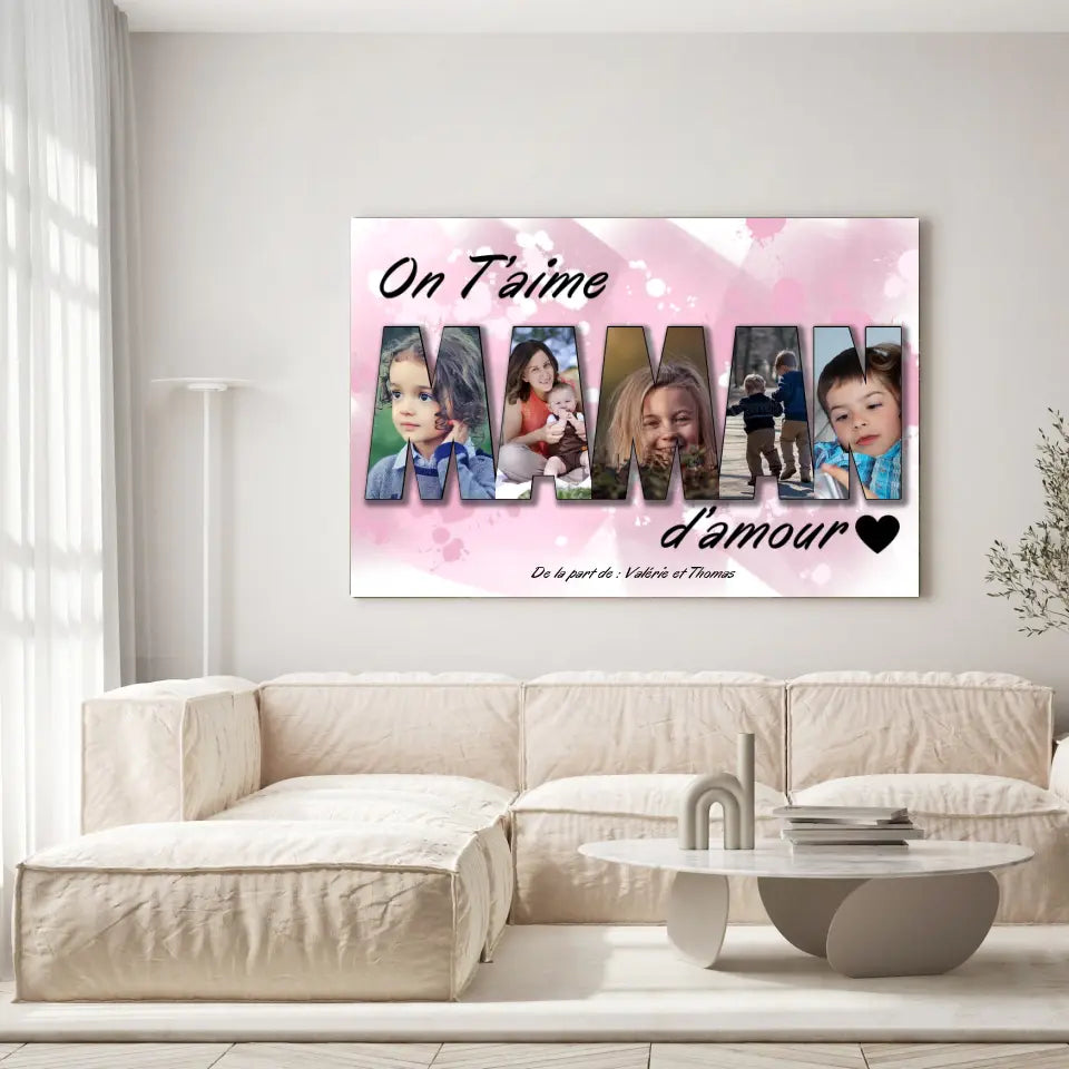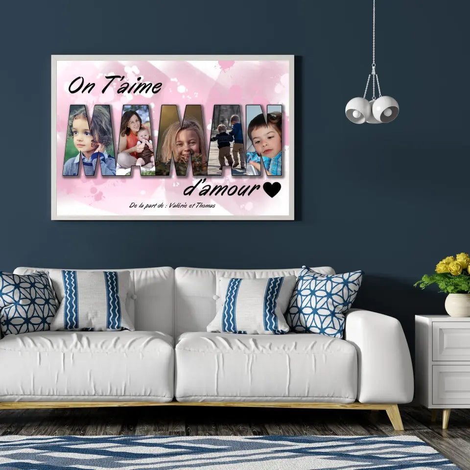 Ce tableau affiche le mot "MAMAN", où chaque lettre est remplie d’une photo de votre choix. Sélectionnez vos plus beaux souvenirs, qu’il s’agisse de moments tendres, de fous rires ou de souvenirs de famille, et créez une affiche aussi belle qu’émouvante.