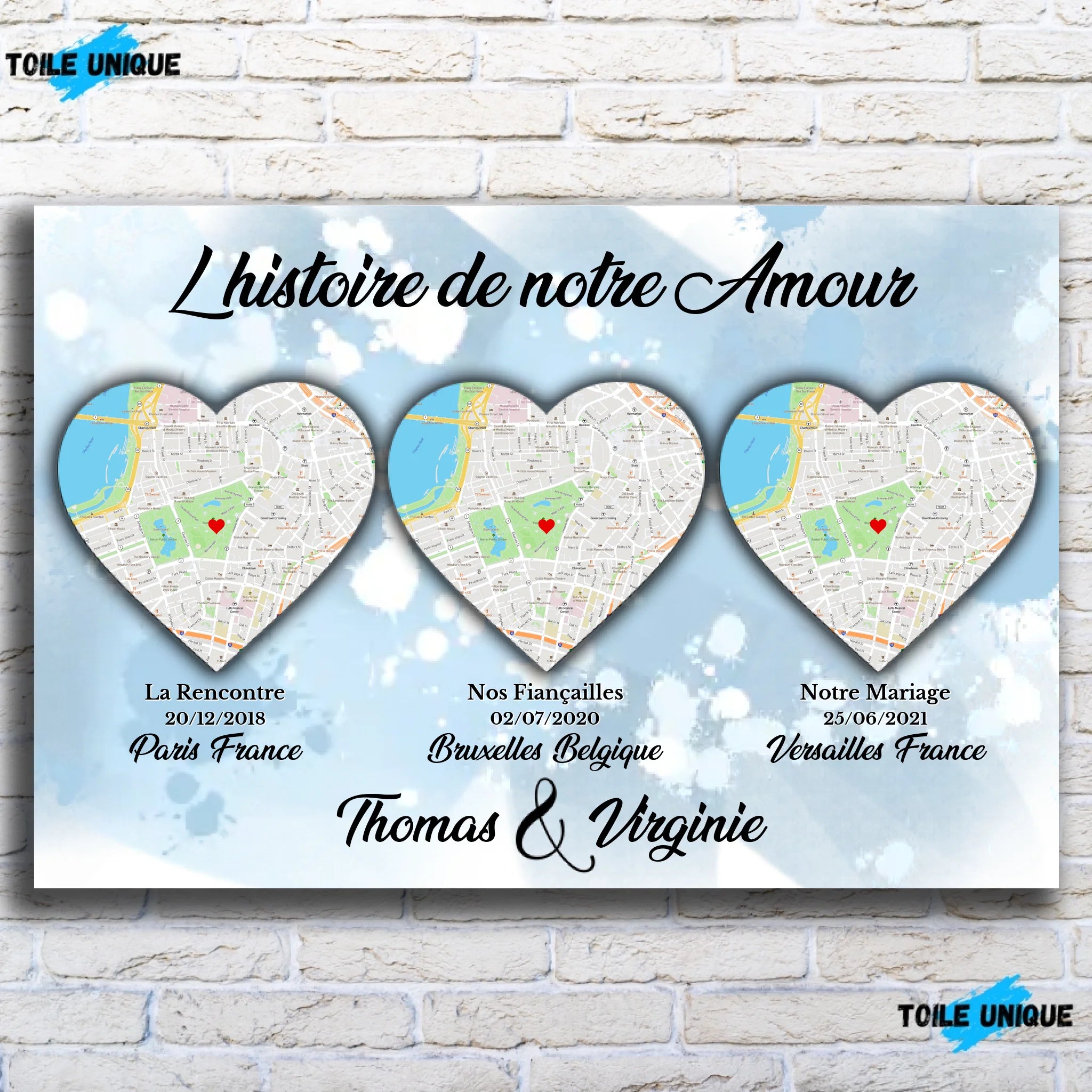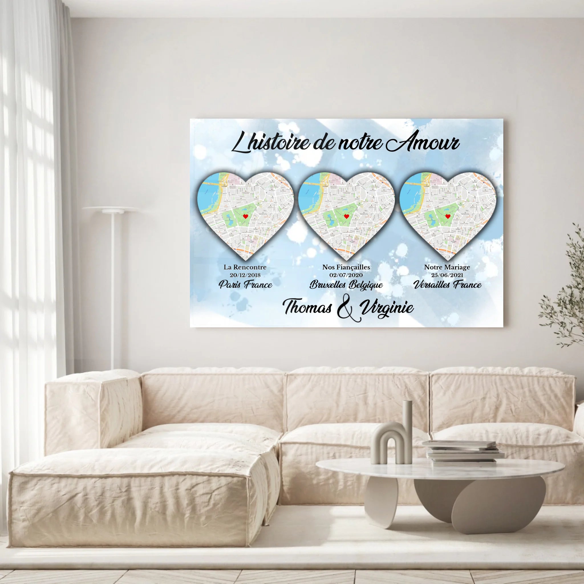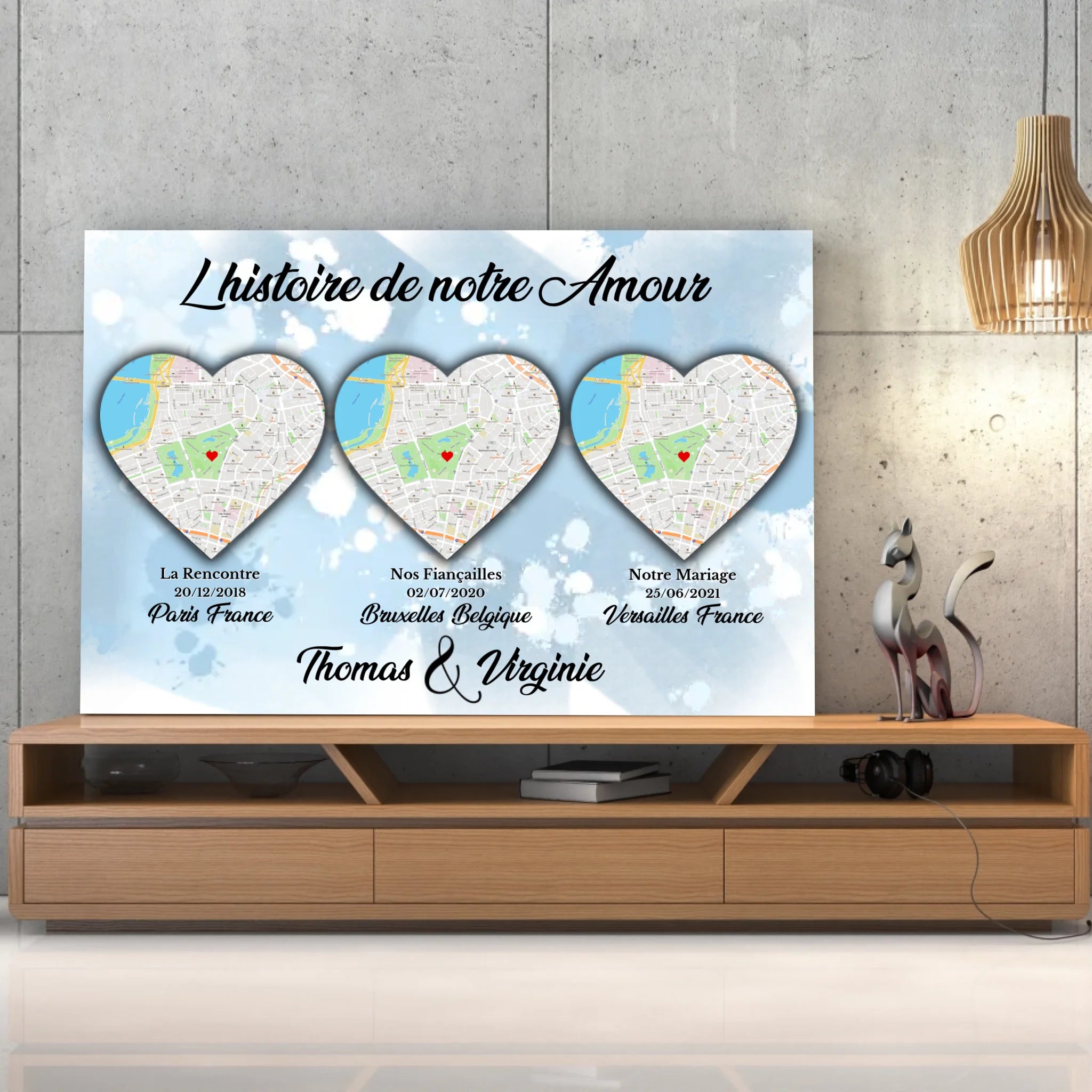 Imaginez vous, face à votre tableau lieu de rencontre, chaque jour. Regarder ces lieux, repenser à ces moments, sourire, rêver, aimer. C'est la magie de cette décoration murale, un véritable hommage à votre amour et à votre histoire.
