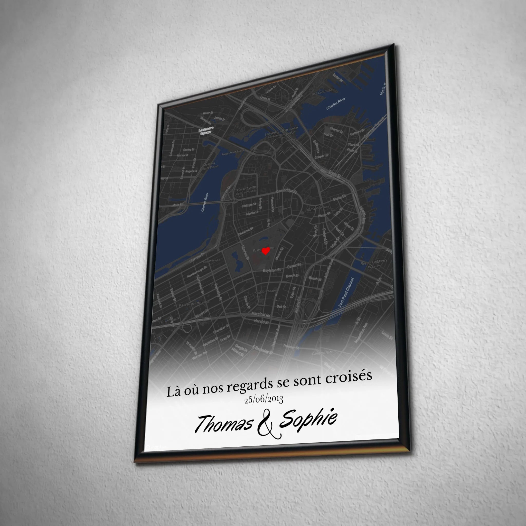 Chaque affiche lieu de rencontre est conçue avec une carte précise du lieu que vous avez choisi, pour rendre votre souvenir aussi exact que touchant.
