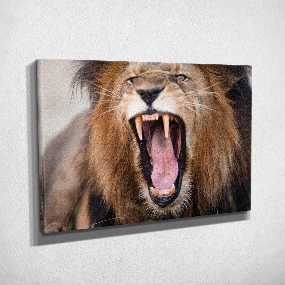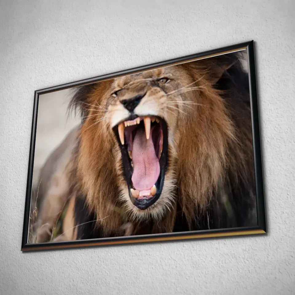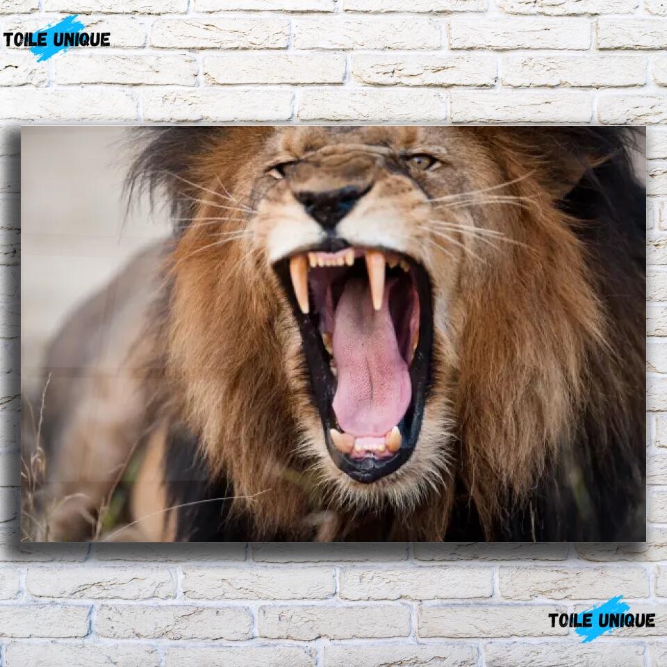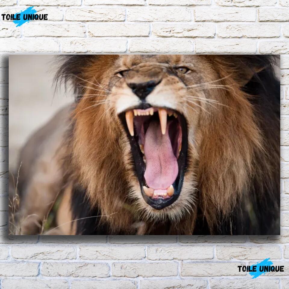 Ce tableau magnifique met en vedette un lion rugissant, sa crinière flamboyante et ses crocs acérés saisissants.