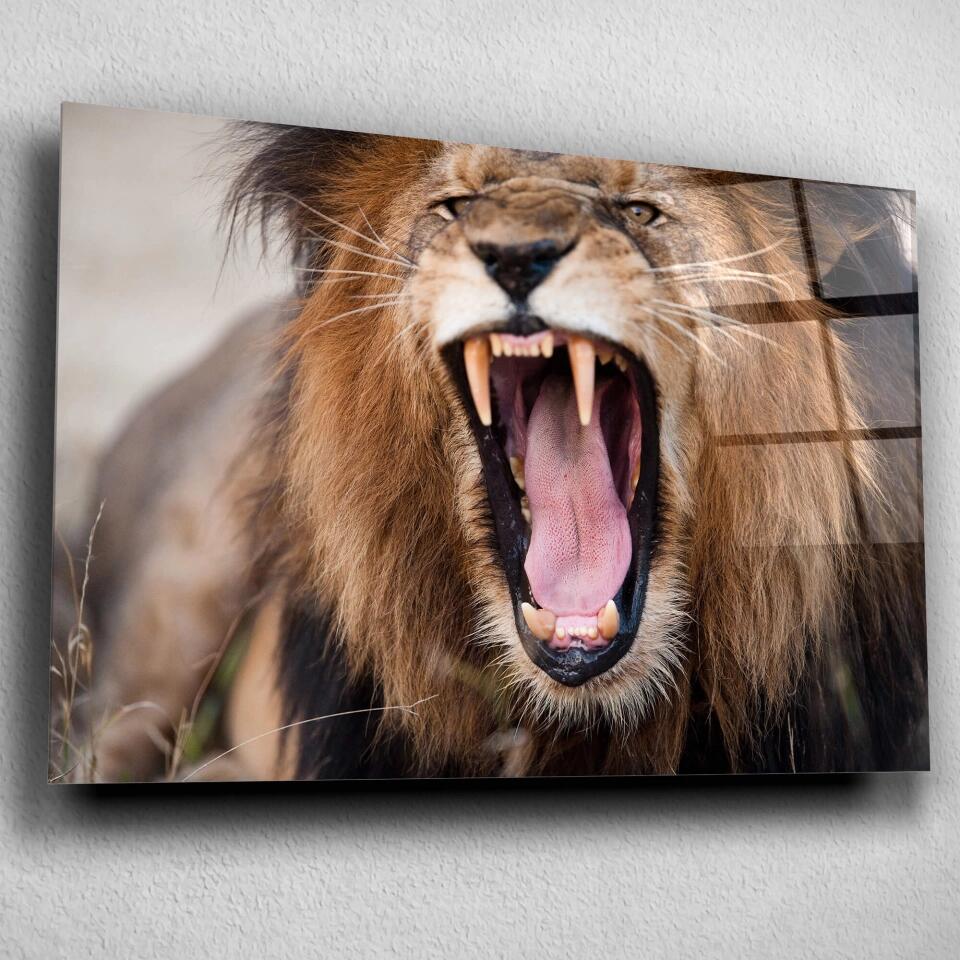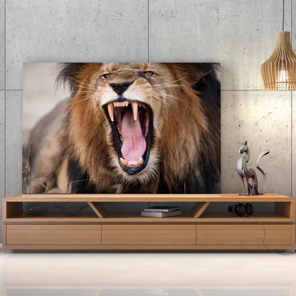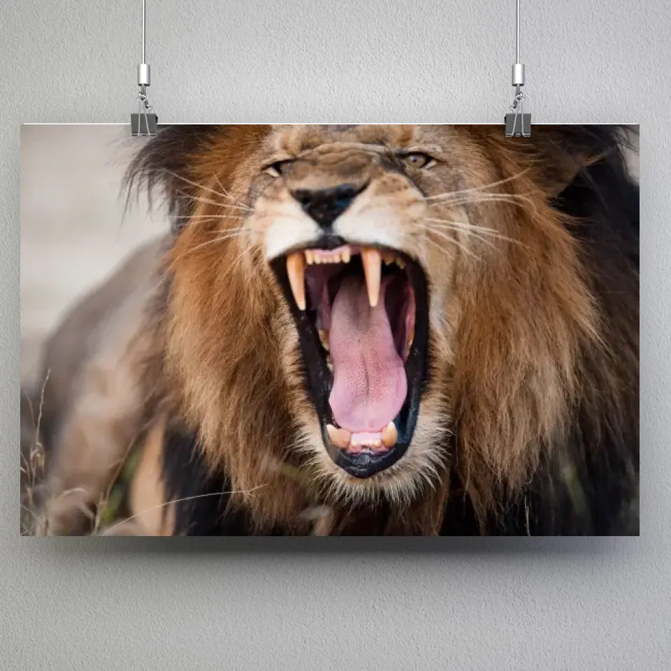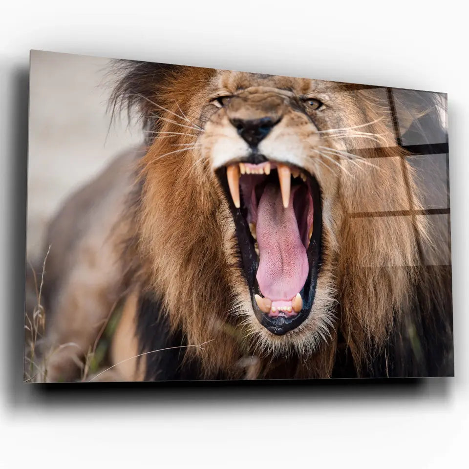 Ce tableau magnifique met en vedette un lion rugissant, sa crinière flamboyante et ses crocs acérés saisissants.