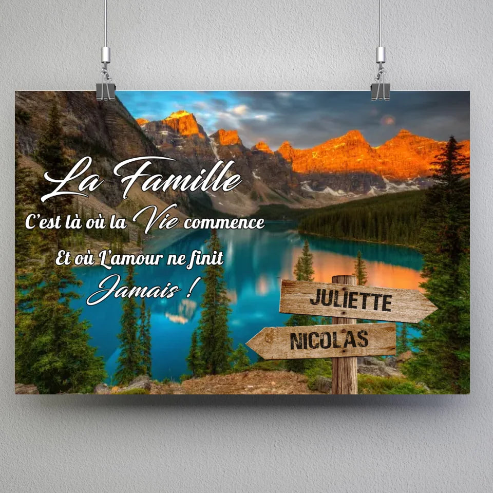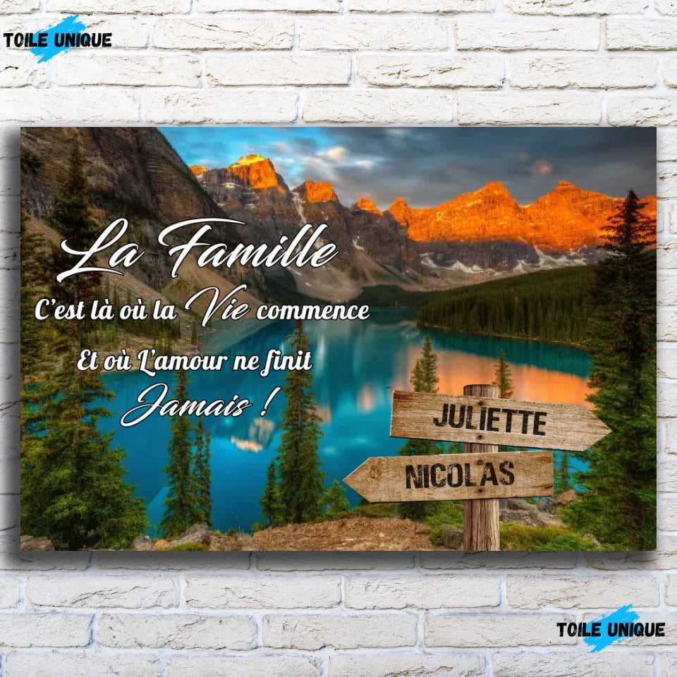 Ce tableau prénoms famille à personnaliser représente une vue d'un lac bleuté magnifique entouré de montagnes.