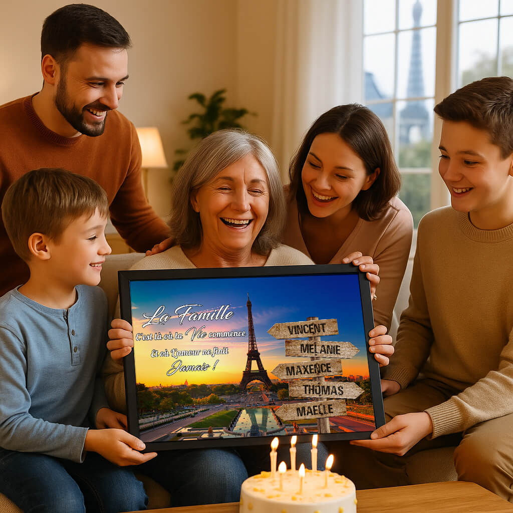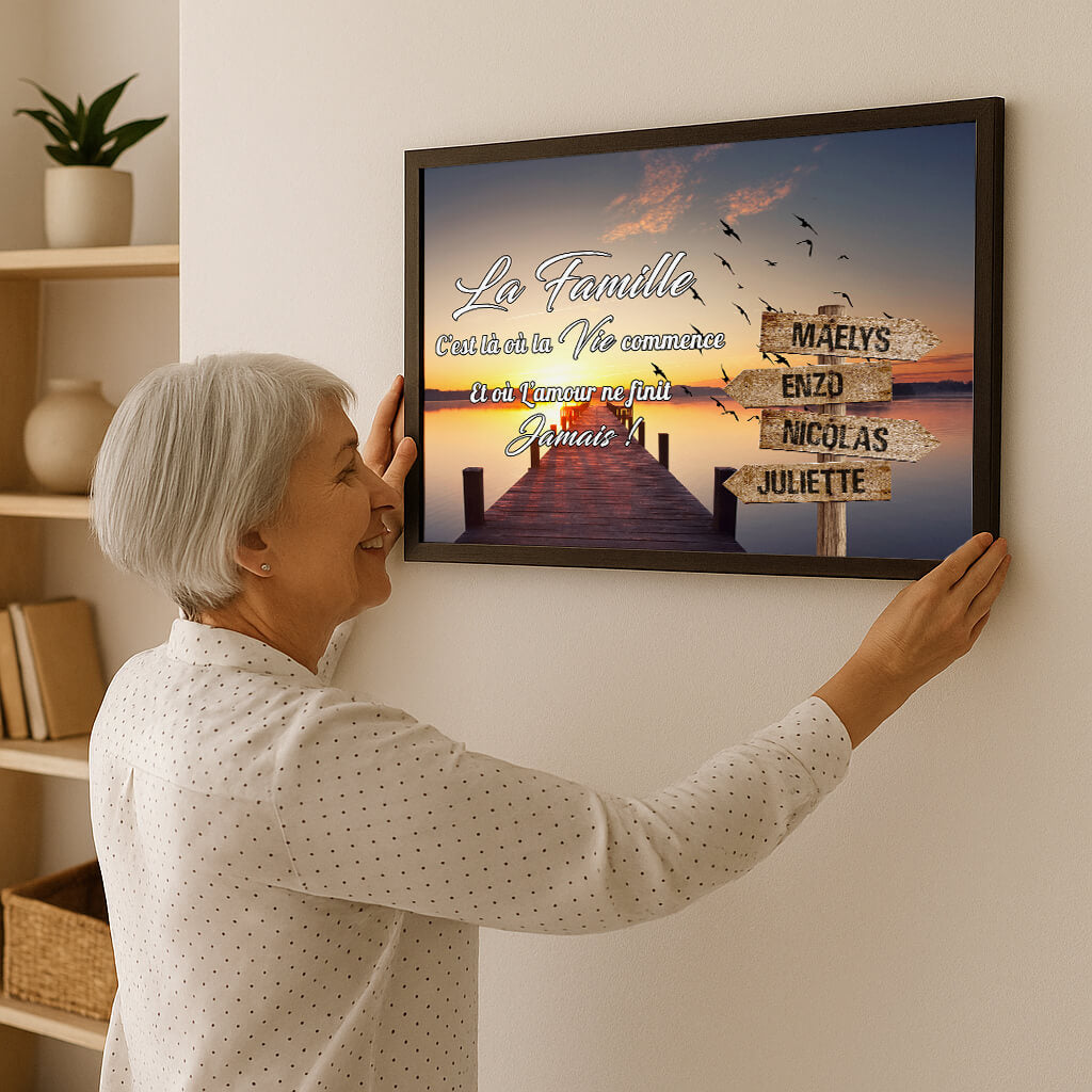 Ce tableau ne se contente pas d'être une simple décoration. Il raconte votre histoire, celle de votre famille, de vos souvenirs, de vos moments partagés. Personnalisez-le en ajoutant jusqu’à 10 prénoms, ceux de vos enfants, de vos parents, de vos amis ou même de vos compagnons à quatre pattes. Et pour rendre ce souvenir encore plus émouvant, choisissez l’une de nos citations inspirantes, comme celle-ci :