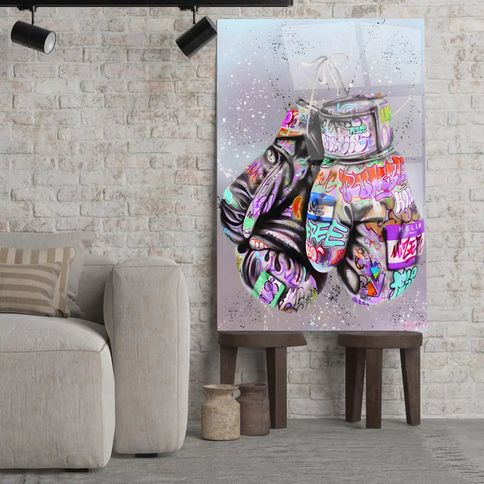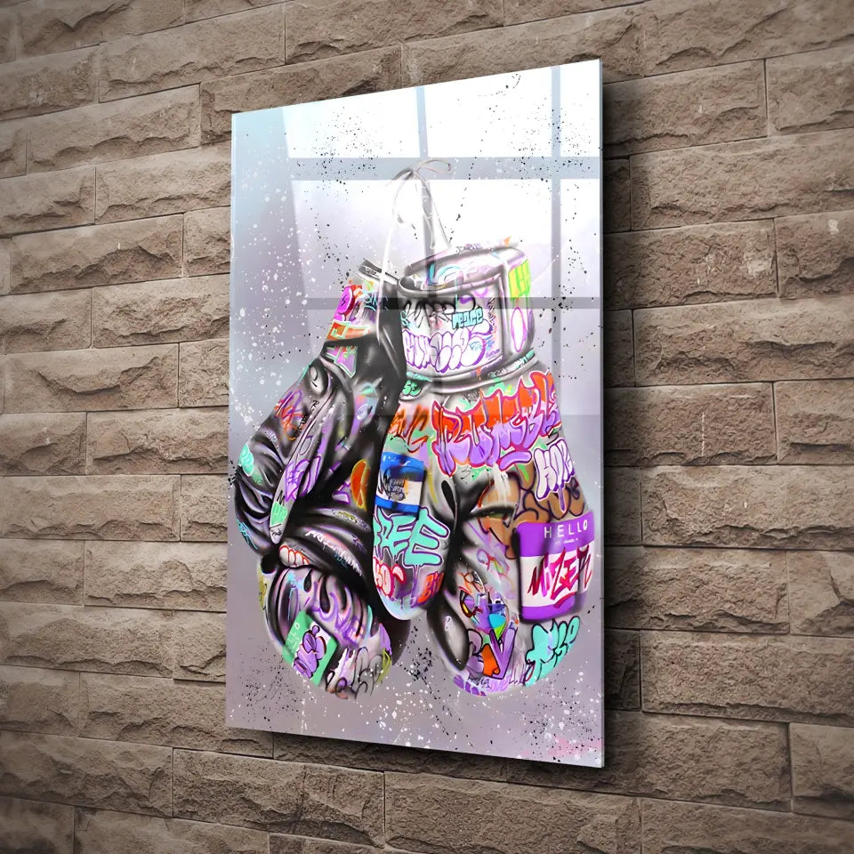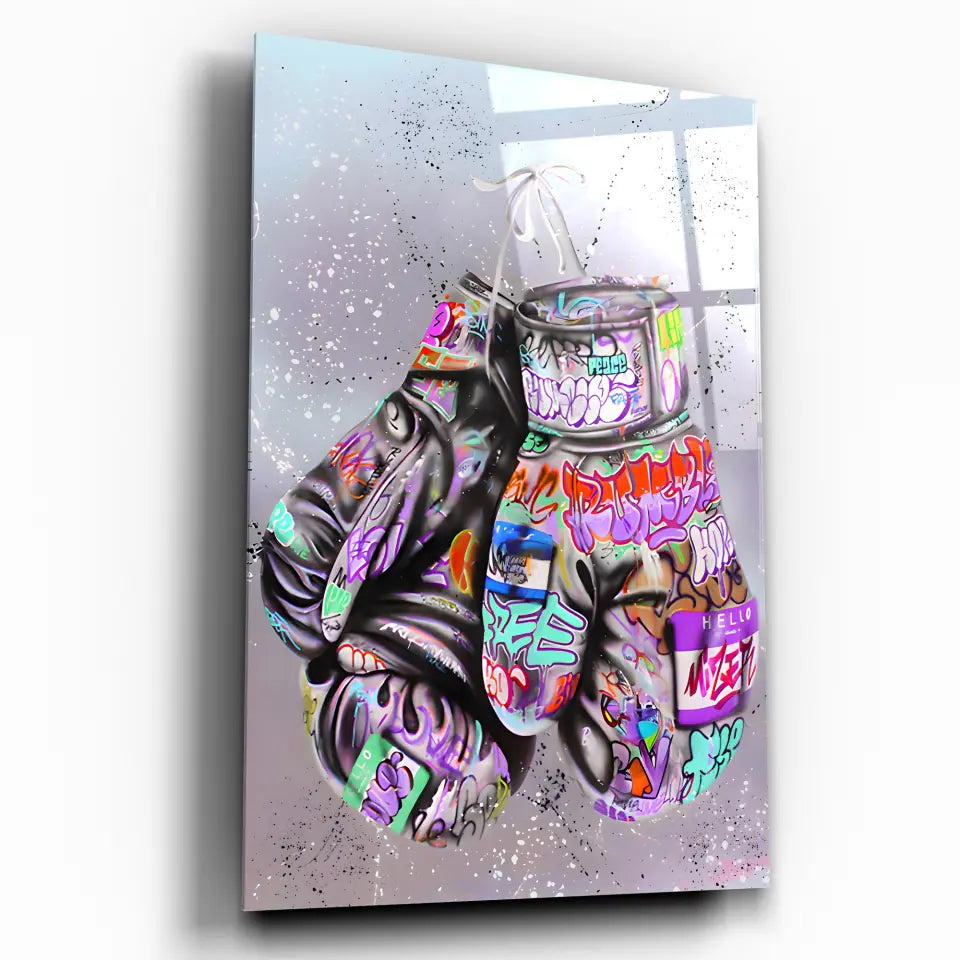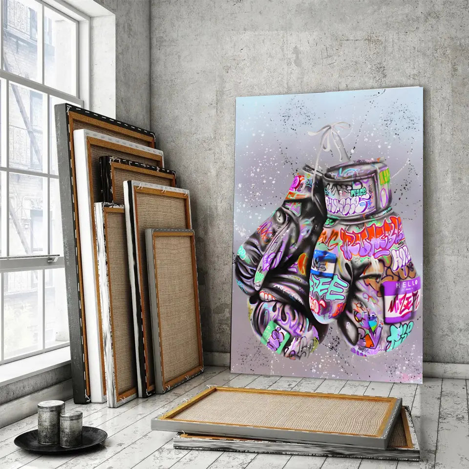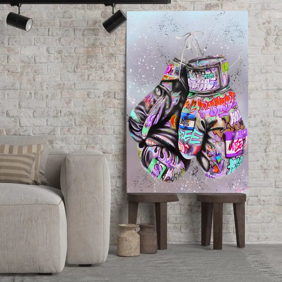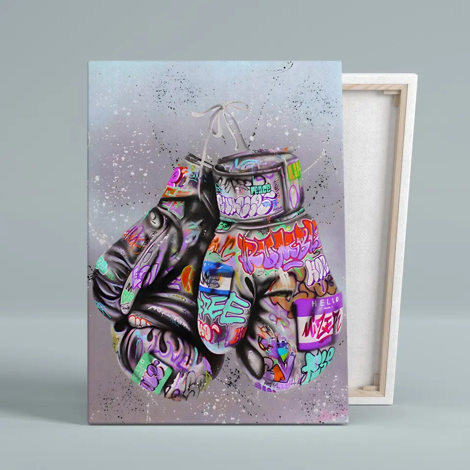 Inspirez-vous de la force et de l'art avec notre tableau Street Art Combat Créatif, mettant en vedette des gants de boxe recouverts de graffiti colorés.
