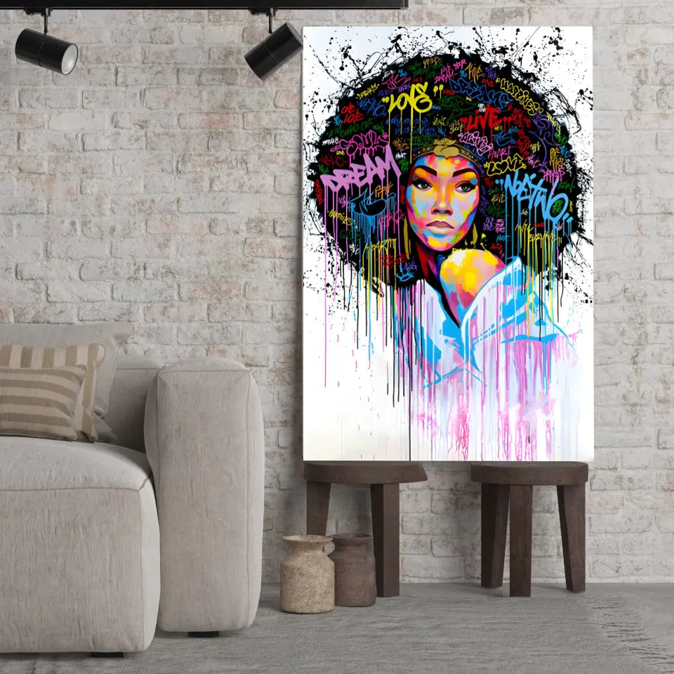 Célébrez la beauté et la force avec notre tableau Street Art Éclat Afro, un portrait vibrant d'une femme africaine.