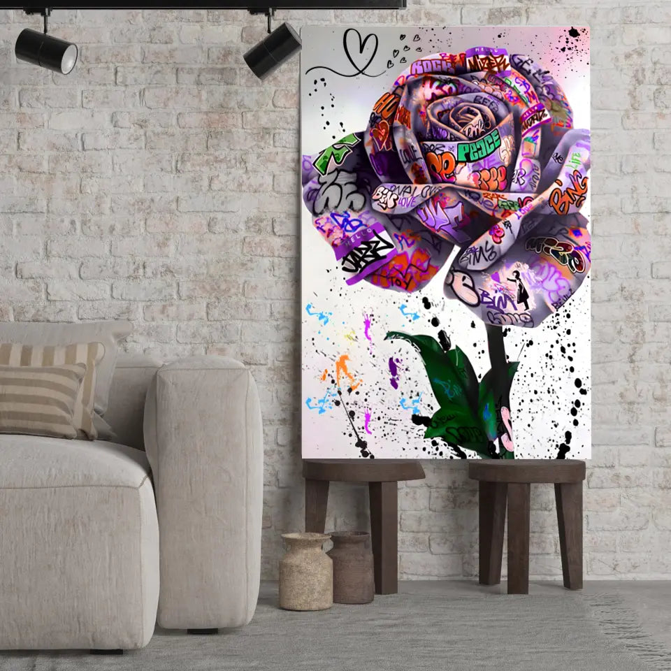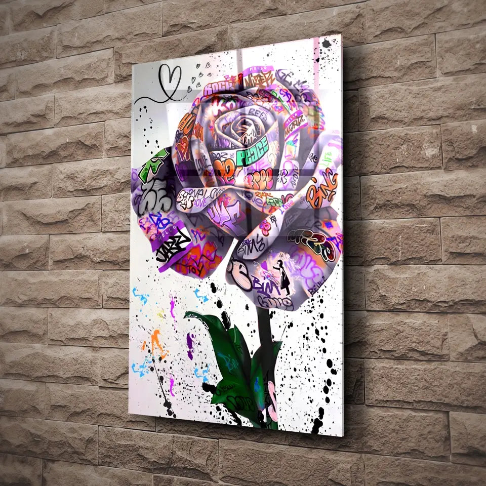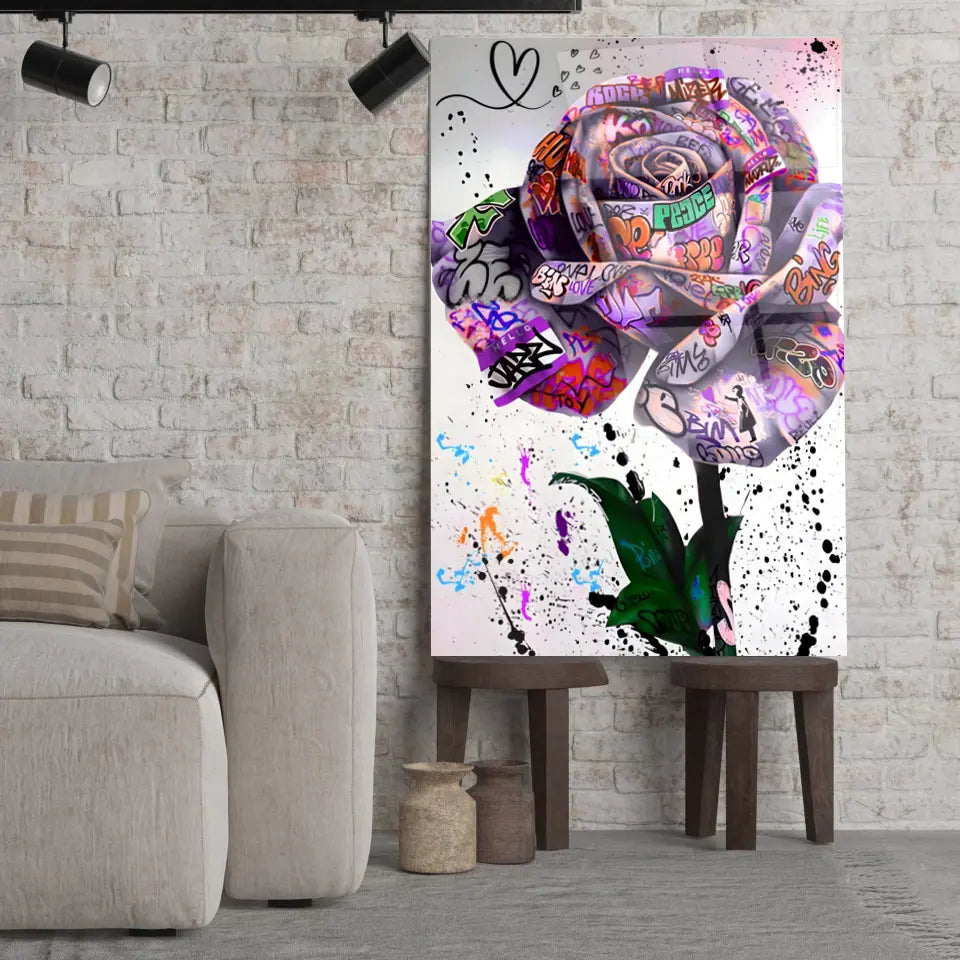 Découvrez notre tableau Street Art "Rose Urbaine", une pièce captivante qui marie la beauté classique de la rose avec l'audace du graffiti.