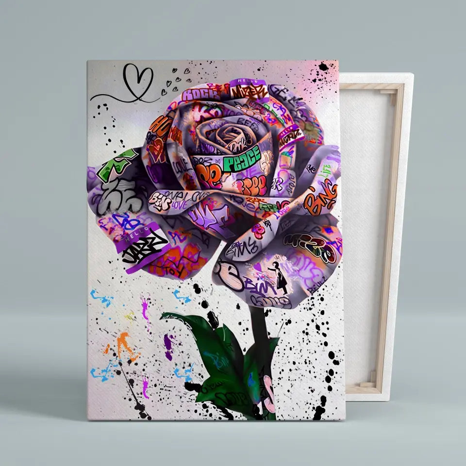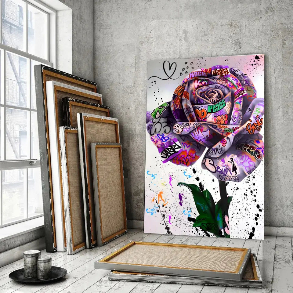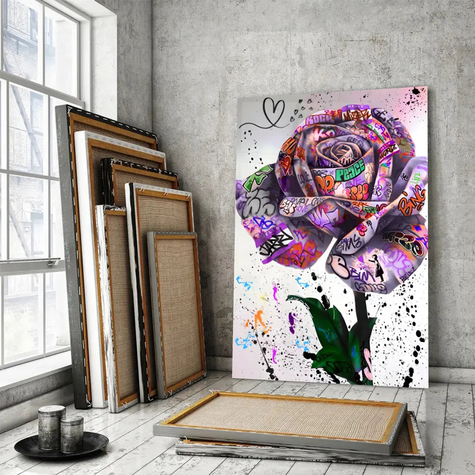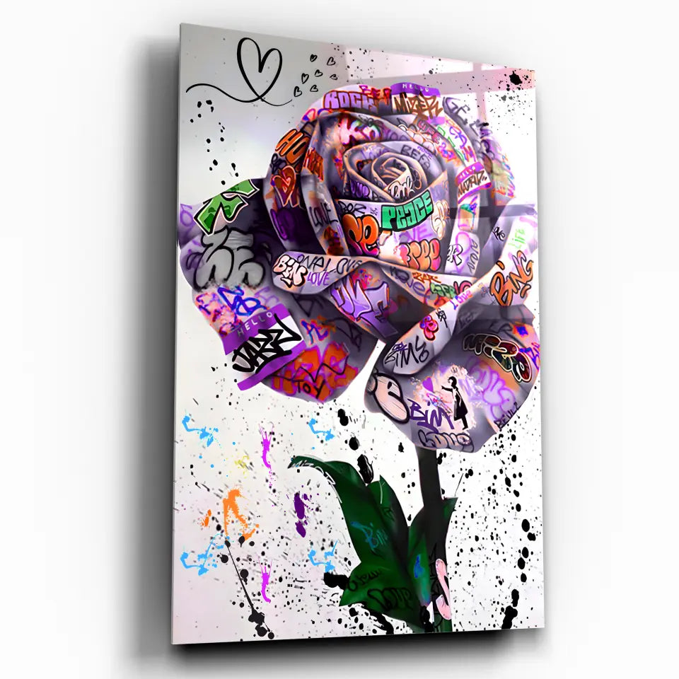 Découvrez notre tableau Street Art "Rose Urbaine", une pièce captivante qui marie la beauté classique de la rose avec l'audace du graffiti.
