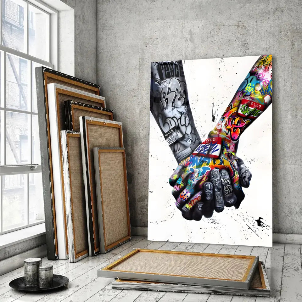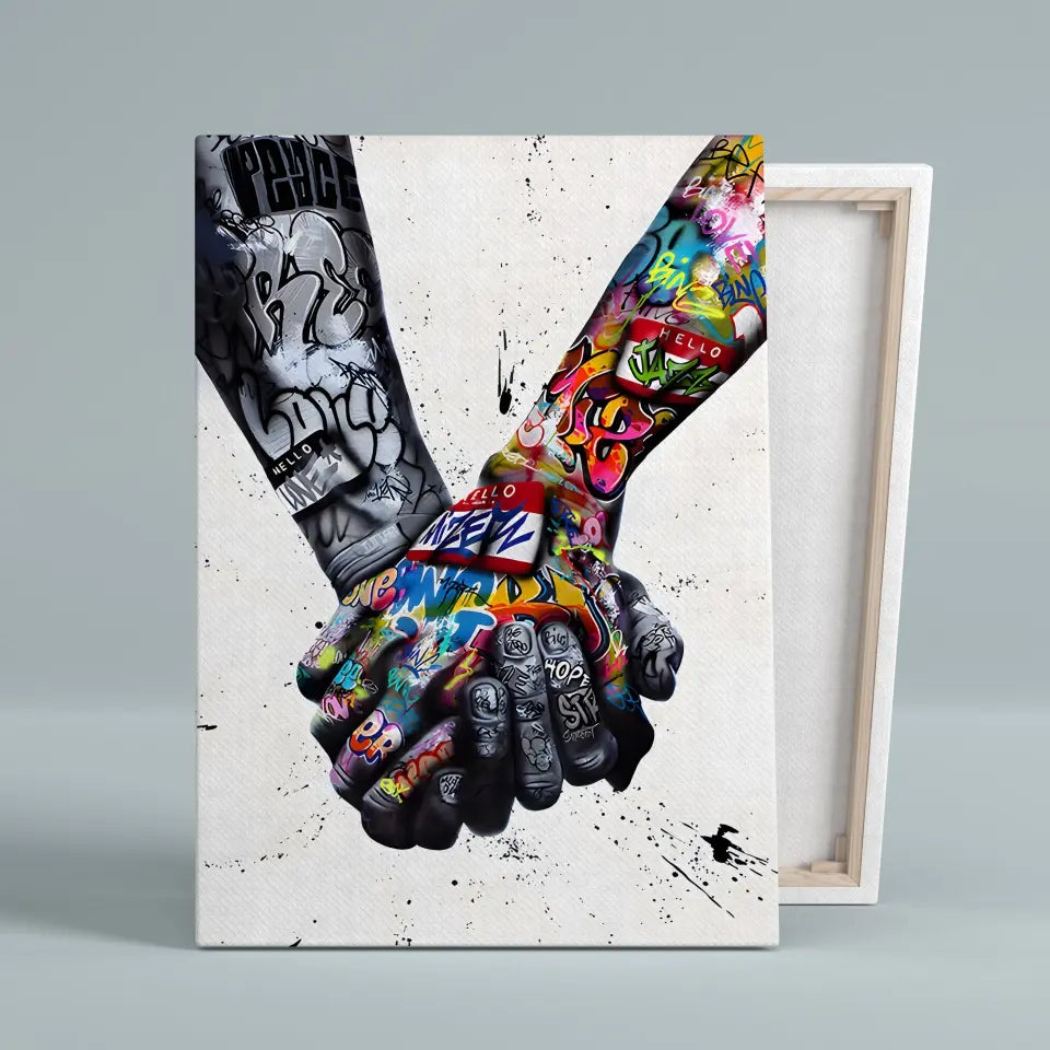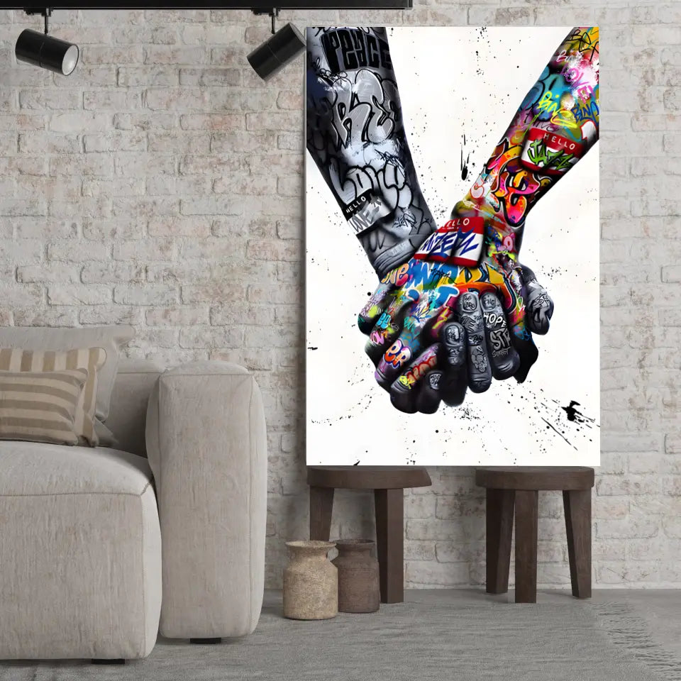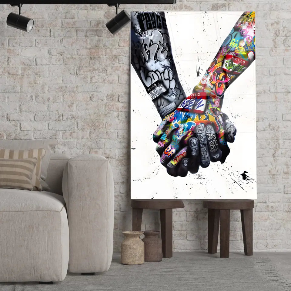 Embrassez l'expression de la solidarité avec notre tableau Street Art Union Colorée, une représentation artistique de deux mains entrelacées, ornées de motifs graffiti vibrants.