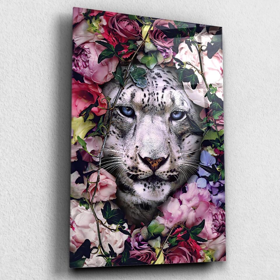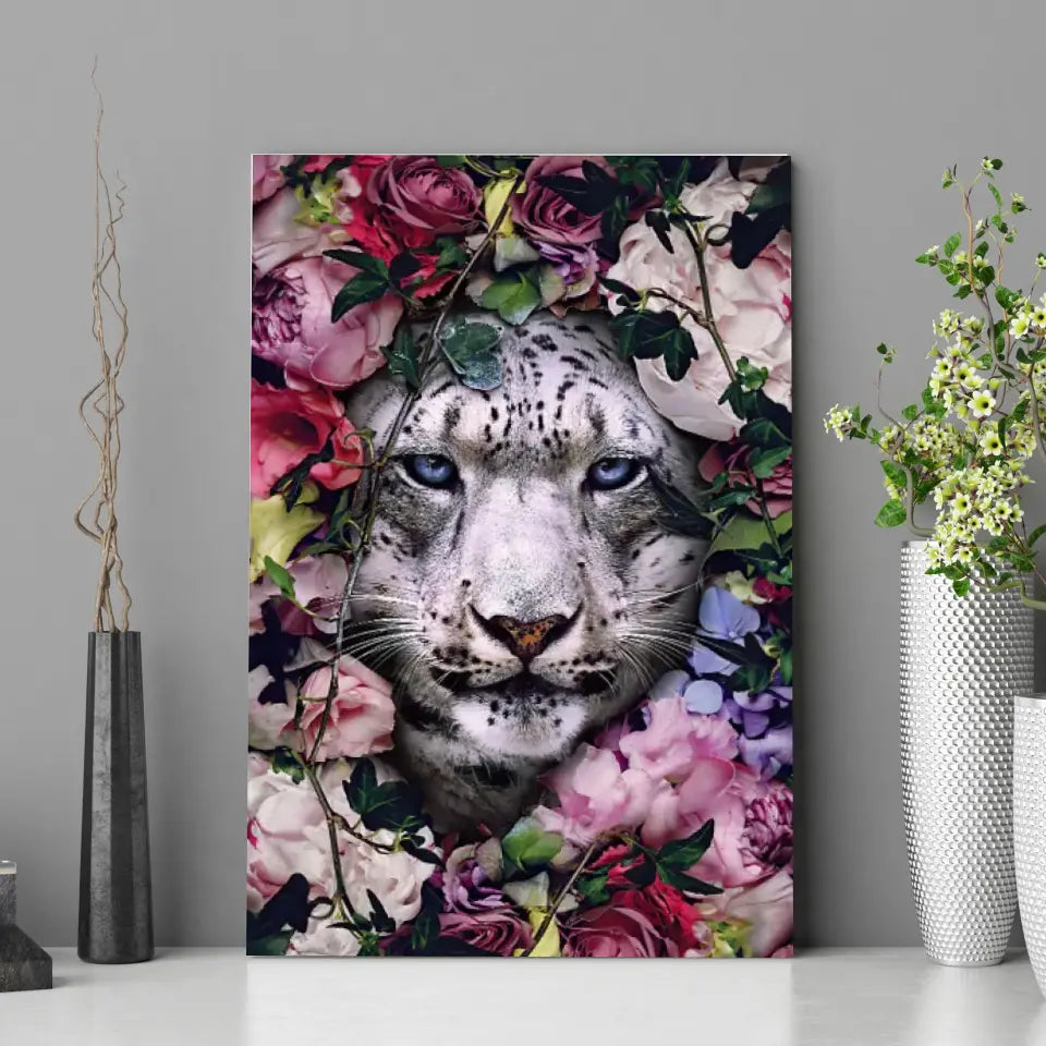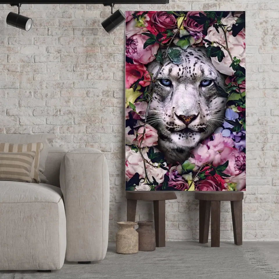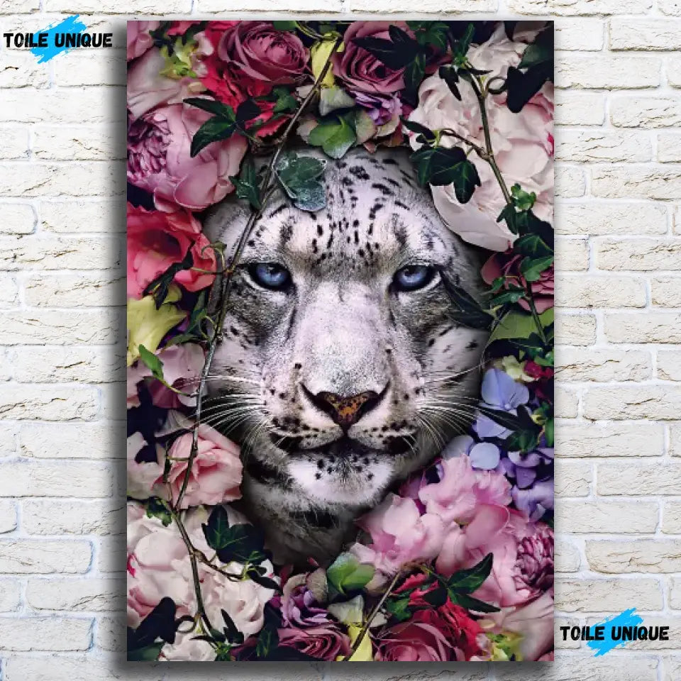 Découvrez le Tableau tigre blanc fleurs